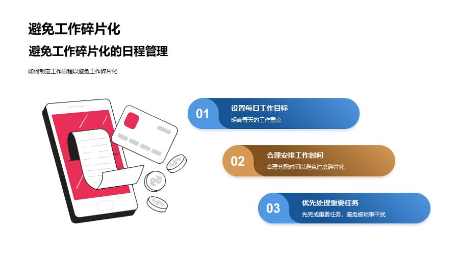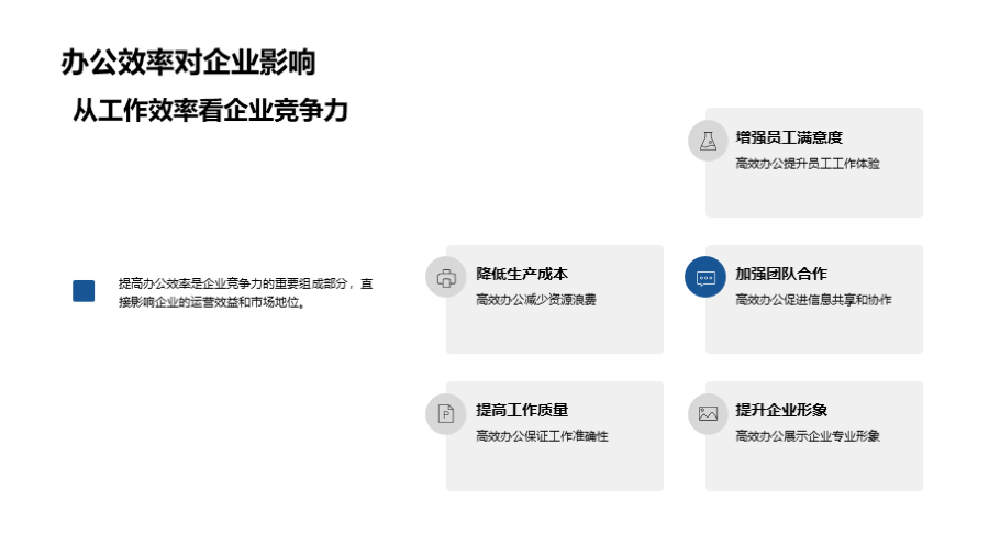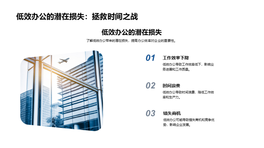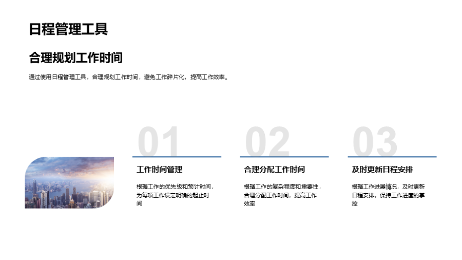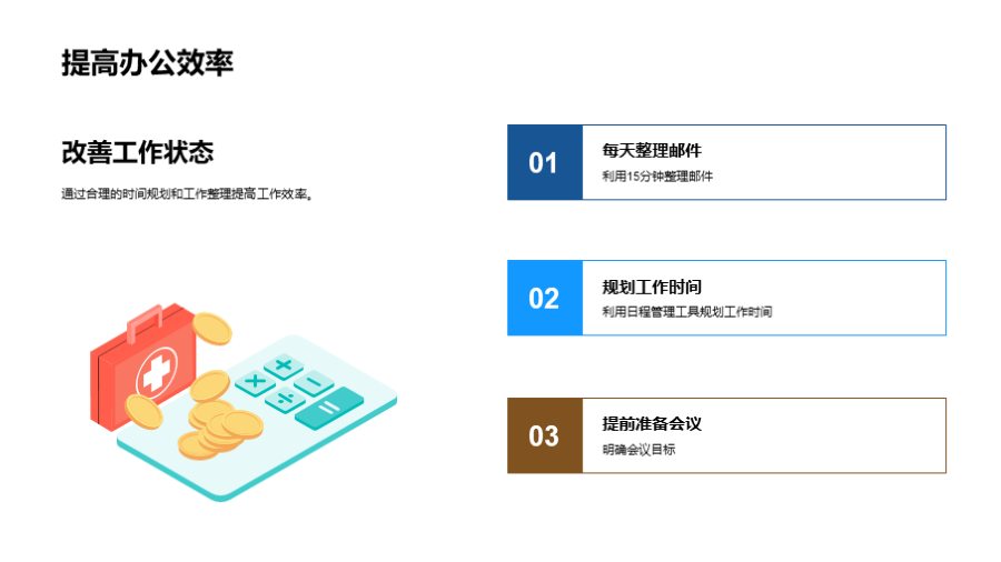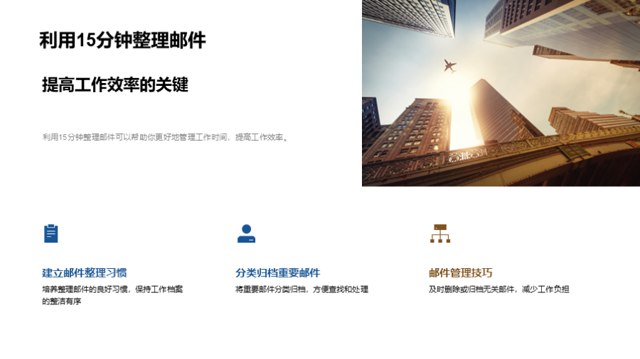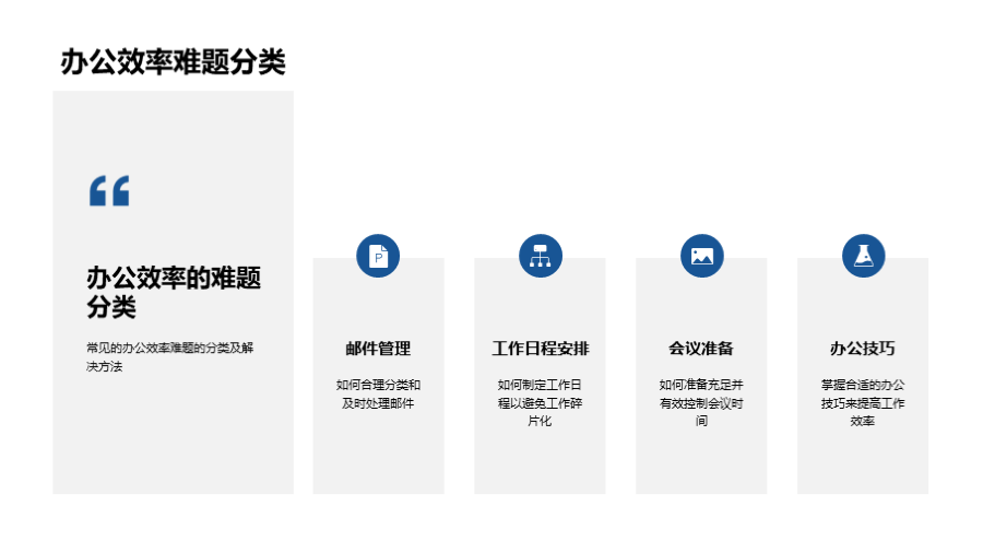 为什么我们要关心办公效率, 办公效率对现代企业的影响, 低效办公给企业带来的潜在损失, 常见的办公效率难题分类, 特性分析及对策, 如何利用邮件管理工具提高效率, 如何合理分类和及时处理邮件, 如何制定工作日程以避免工作碎片化, 推荐的日程 文件大小:3.97 MB 页数:26 页 分辨率:16*9 📸 产品预览 — 1秒登录查看完整内容 — 账号登录