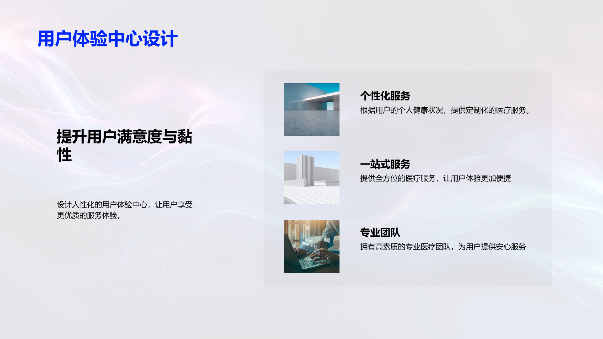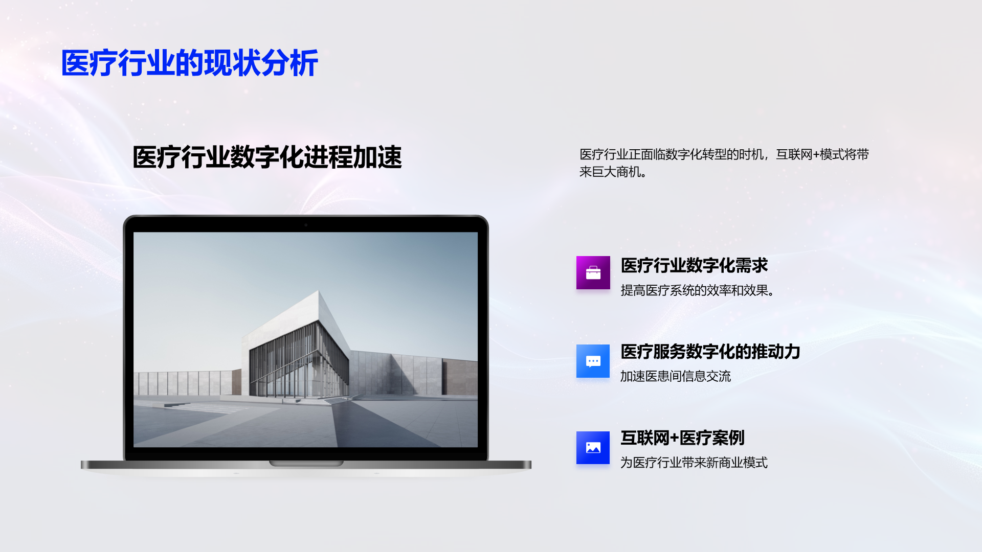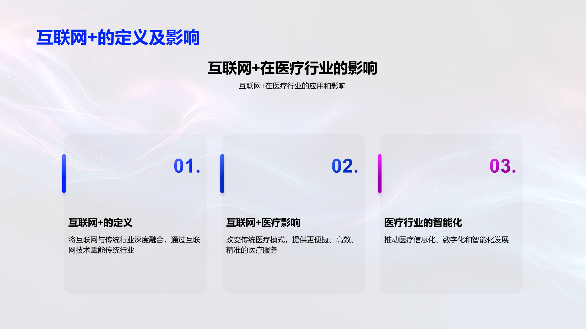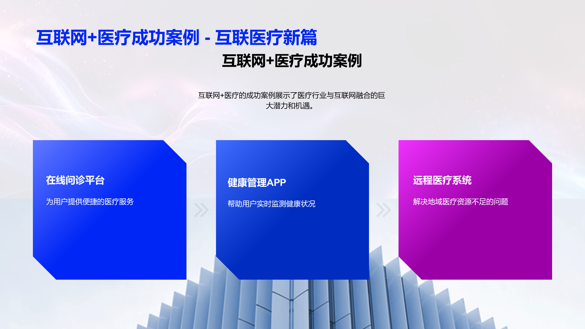 互联网+的定义及其在不同行业的影响, 医疗行业的现状与发展趋势, 医疗服务数字化的必然性, 案例分析:互联网+医疗的成功模式, 创新的在线诊疗服务模式, 整合医疗资源的药品配送系统, 用户体验中心设计理念, 构建健康管理生态系统的愿景, 应 文件大小:5.22 MB 页数:28 页 分辨率:16*9 📸 产品预览 — 1秒登录查看完整内容 — 账号登录
