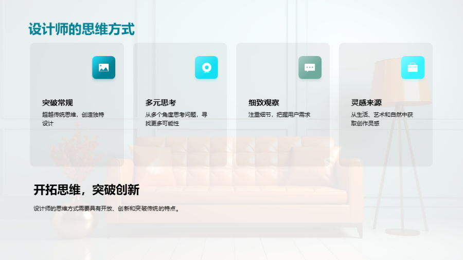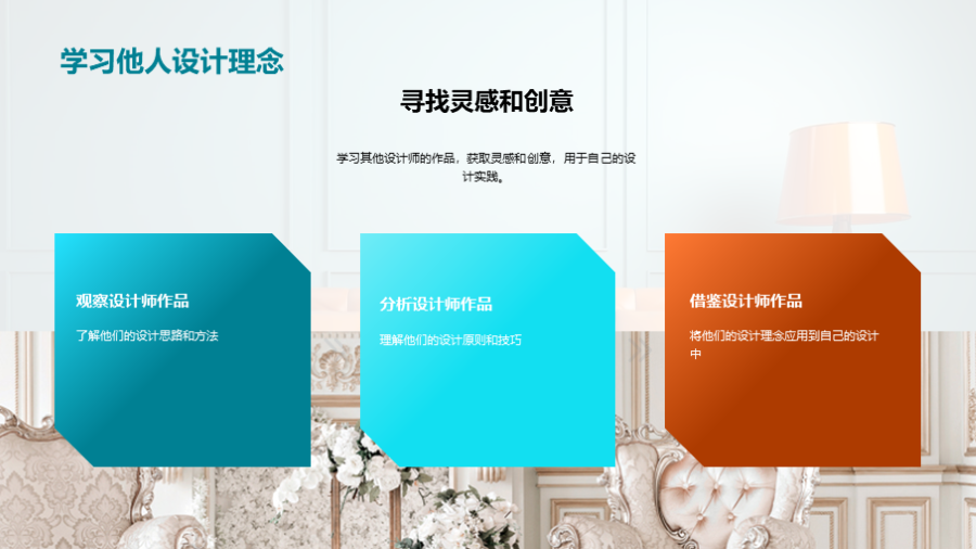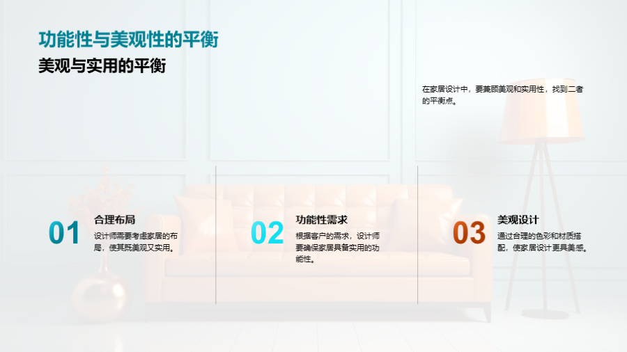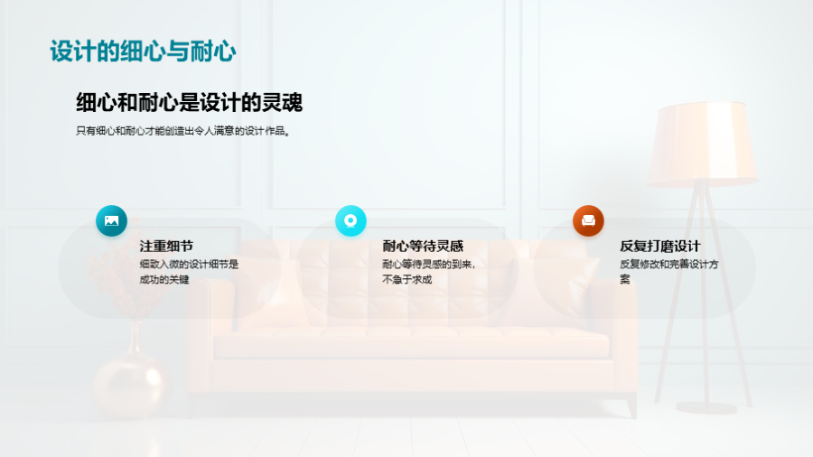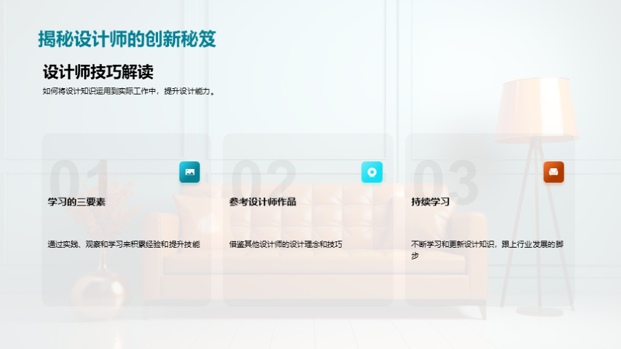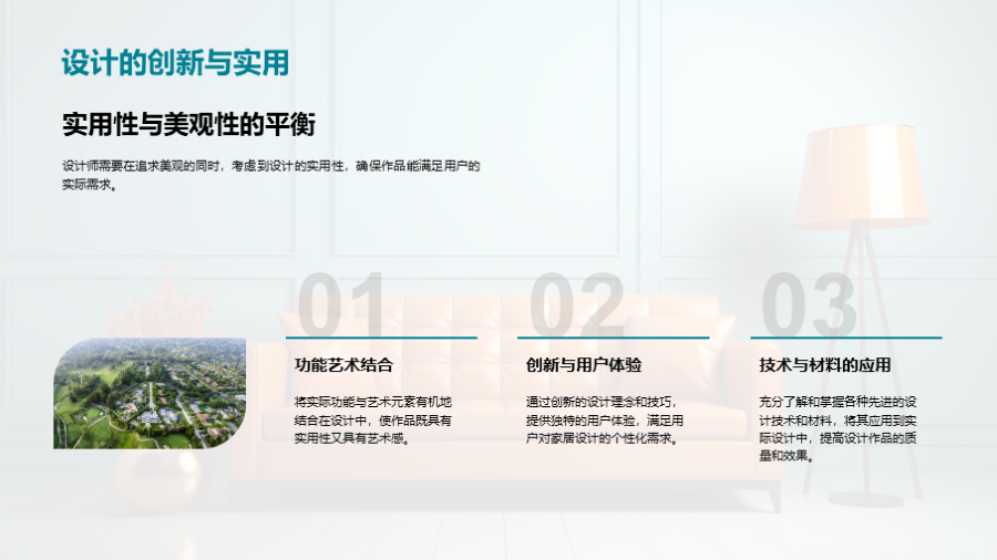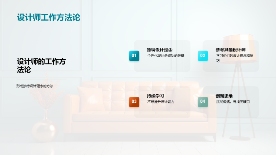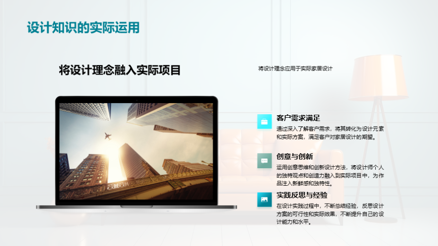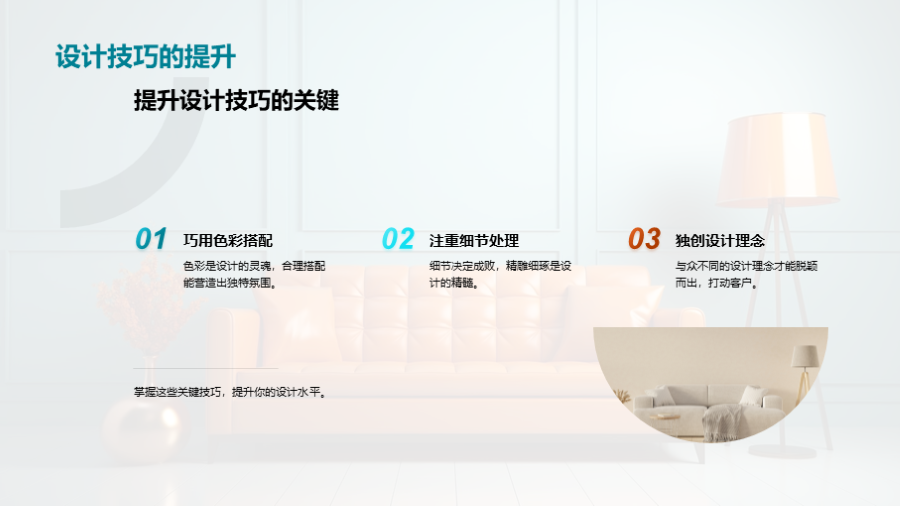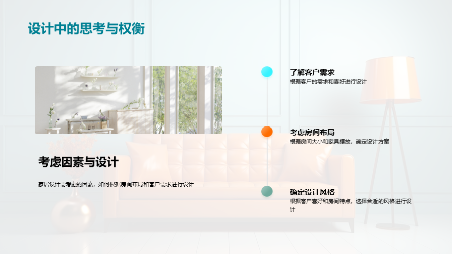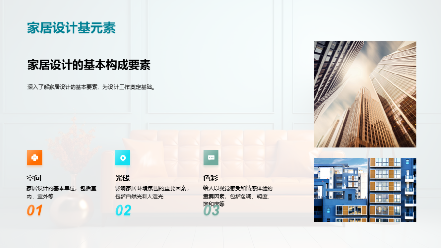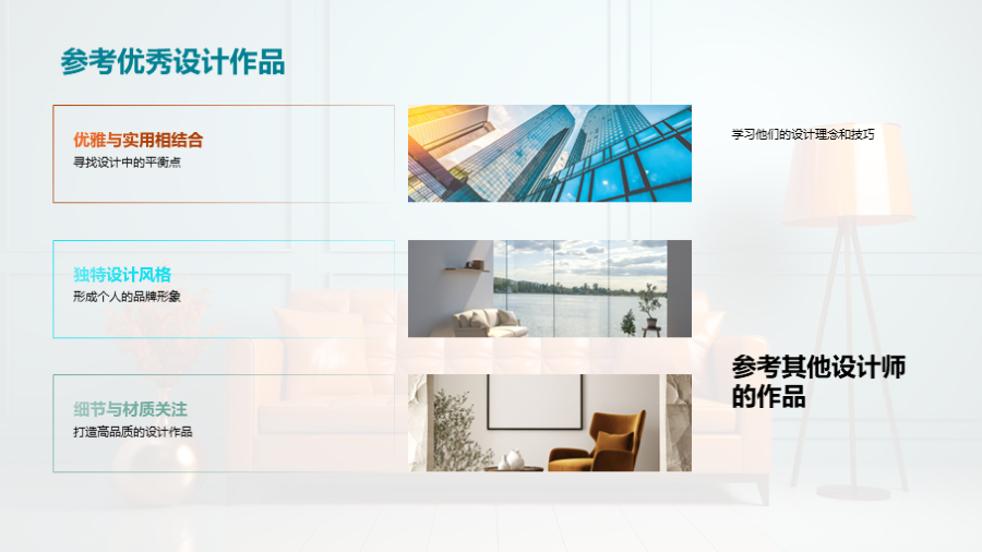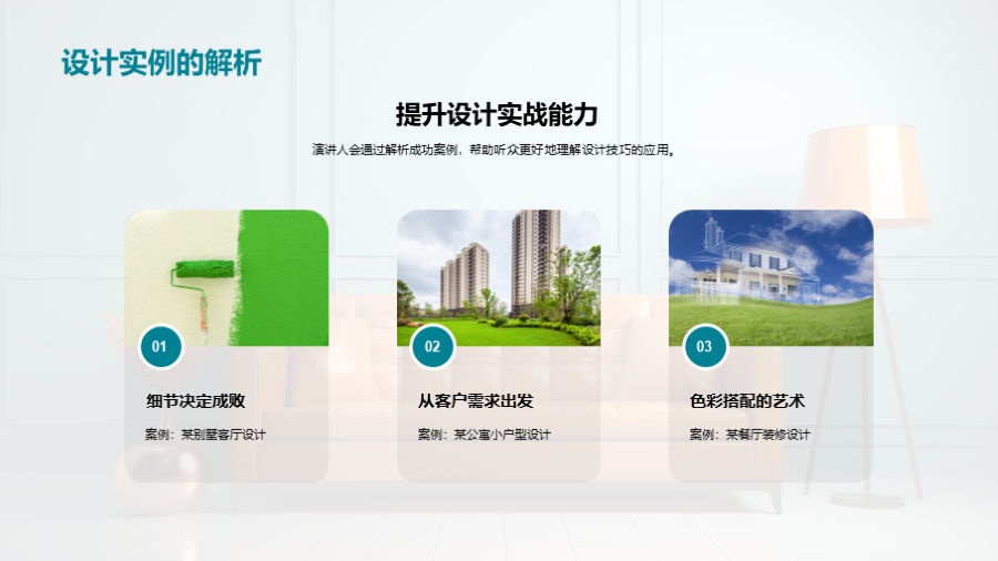 家居设计的基本元素, 家居设计的原则, 家居设计流程, 设计师的工作方法和技巧, 家居设计需考虑的因素, 如何根据房间布局和客户需求进行设计, 色彩和材质的搭配, 功能性和美观性的平衡, 预算和时间的控制, 多实践、多观察、多学习的重要性, 文件大小:9.11 MB 页数:33 页 分辨率:16*9 📸 产品预览 — 1秒登录查看完整内容 — 账号登录