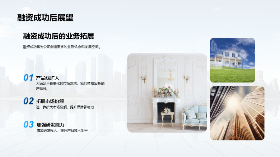 房地产市场的发展形势, 公司的发展战略, 公司的融资需求, 融资计划的详细说明, 融资将为公司带来的发展机会, 融资成功后公司的规模扩大及品牌影响力提升, 资金用于扩大生产规模的具体计划, 资金用于增加市场投入的策略, 融资对公司发展的影响 文件大小:6.22 MB 页数:33 页 分辨率:16*9 📸 产品预览 — 1秒登录查看完整内容 — 账号登录