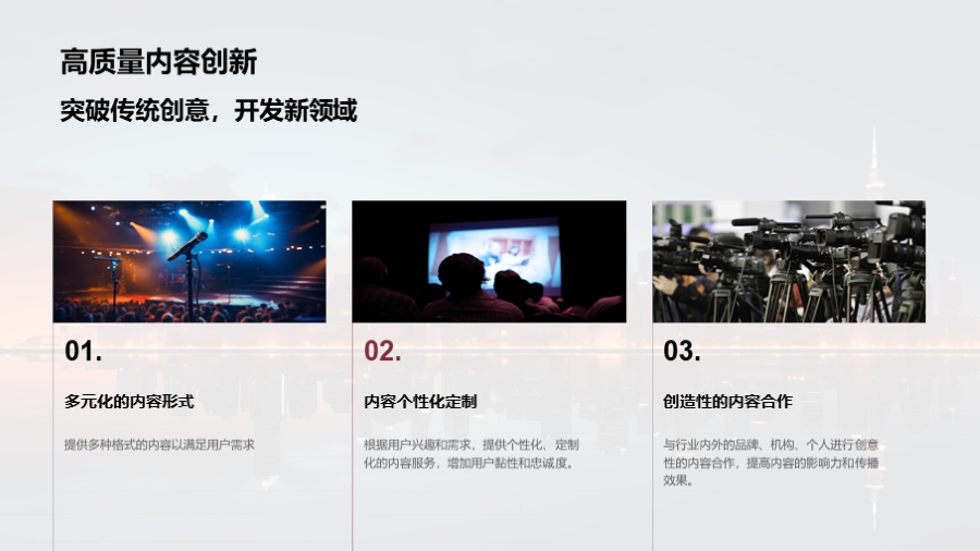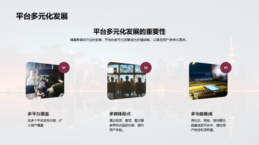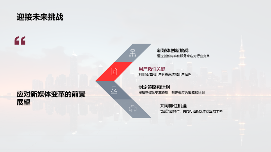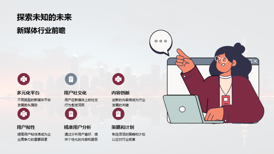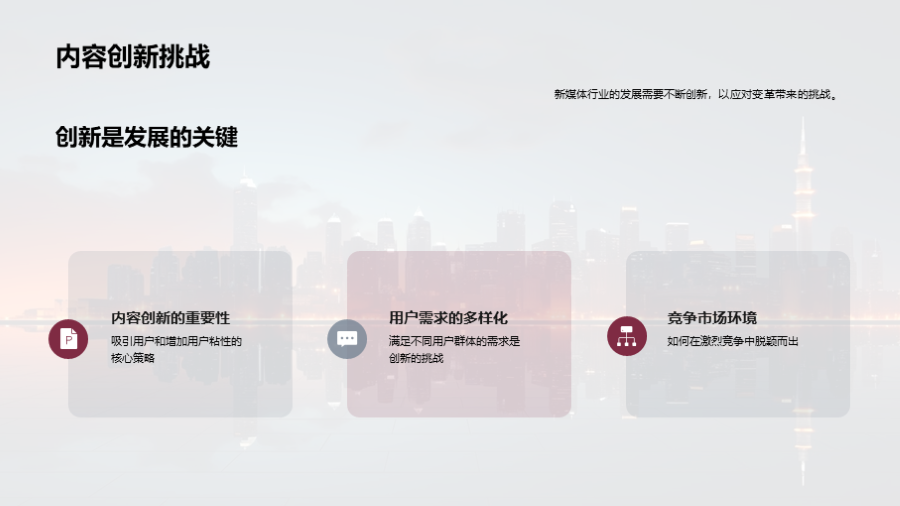新媒体内容的碎片化趋势, 平台的多元化发展, 用户社交化的新媒体行为模式, 广泛的用户群体和巨大的市场需求, 内容创新和用户粘性的挑战, 如何从挑战中找寻机遇, 通过高质量的内容创新应对行业变革, 利用精准的用户分析来增加用户粘性, 利用新 文件大小:3.49 MB 页数:33 页 分辨率:16*9 📸 产品预览 — 1秒登录查看完整内容 — 账号登录