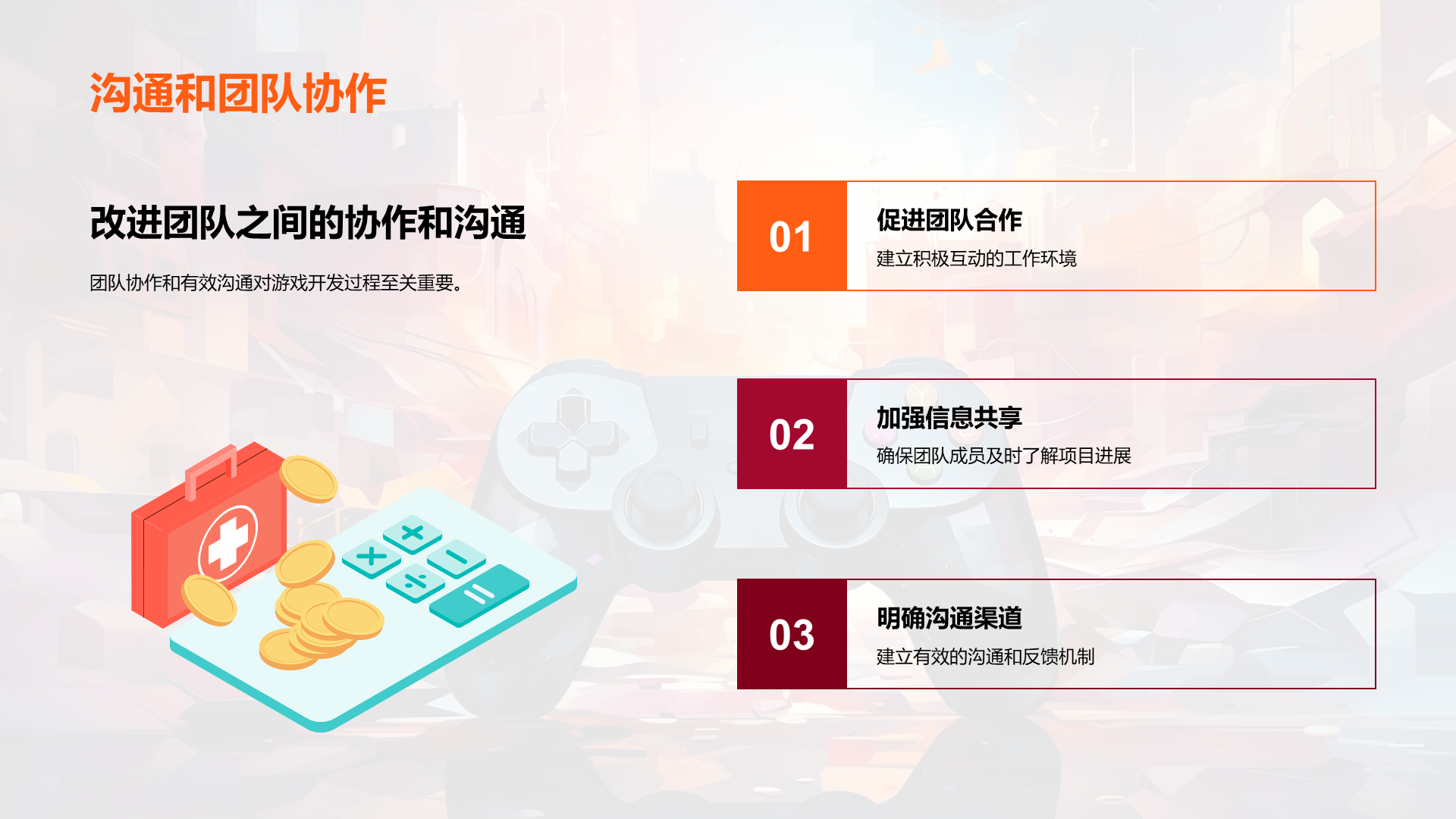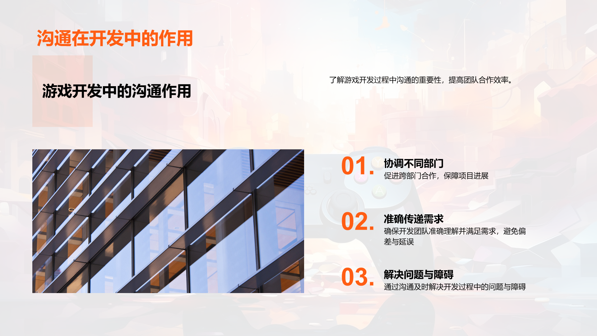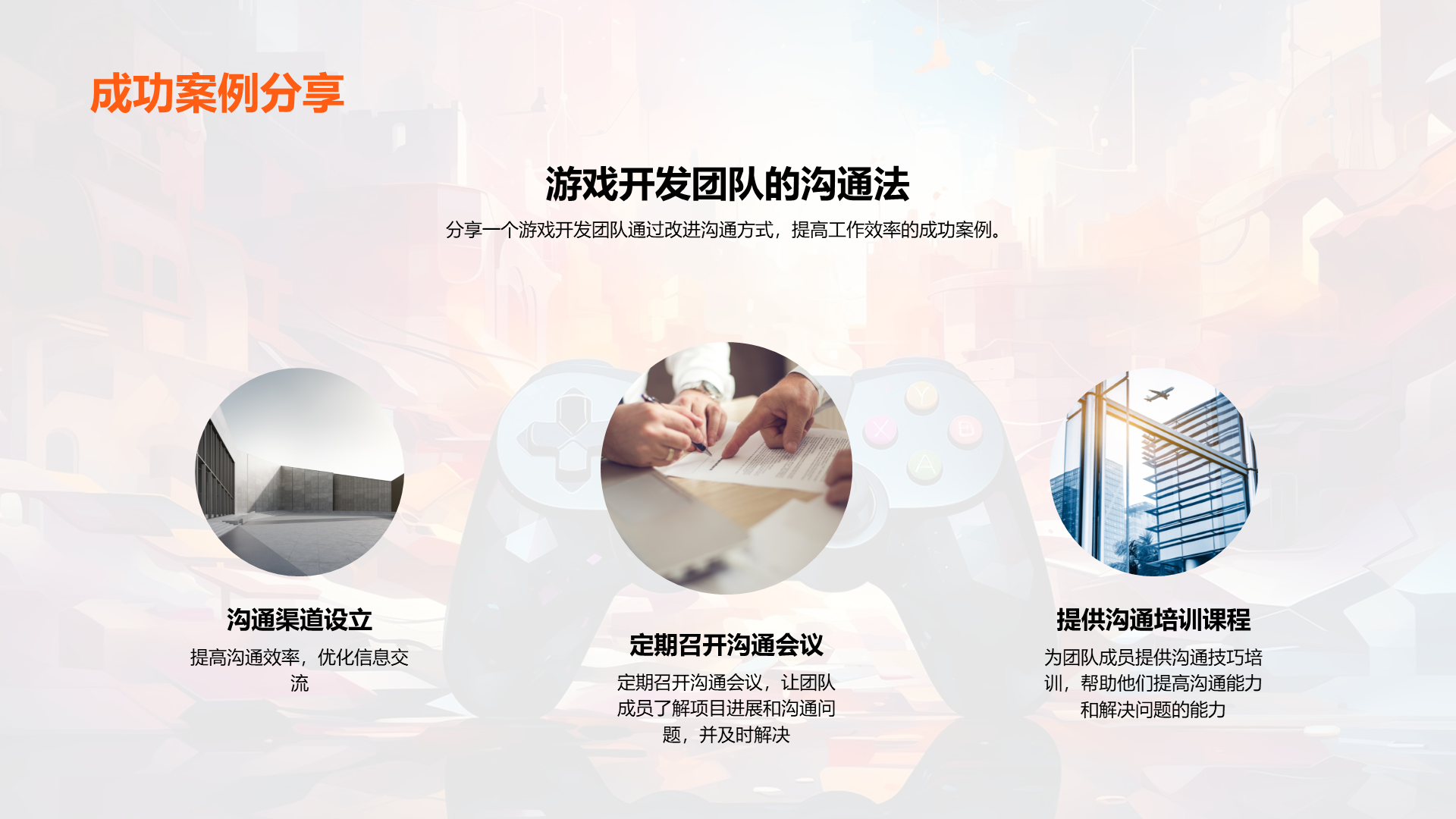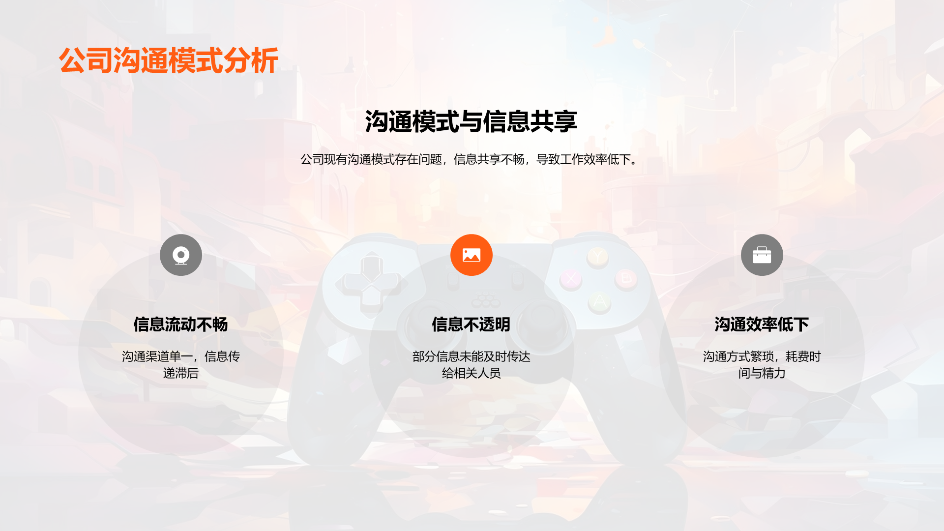 理解游戏开发的基本流程, 阐述内部沟通在游戏开发过程中的重要性, 分析公司现有的沟通模式, 识别出现有模式中的问题,如信息不透明,沟通不及时等, 说明良好沟通如何提高工作效率, 讨论良好沟通对公司发展的贡献, 提议定期的内部沟通会议, 建议 文件大小:4.24 MB 页数:28 页 分辨率:16*9 📸 产品预览 — 1秒登录查看完整内容 — 账号登录