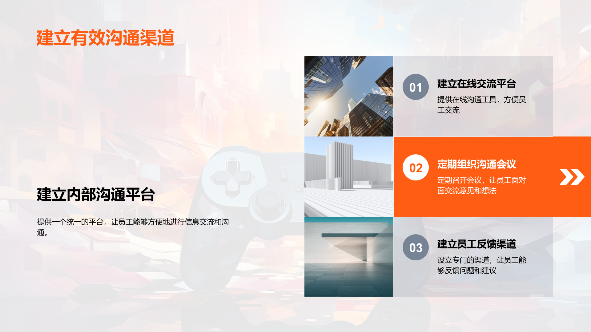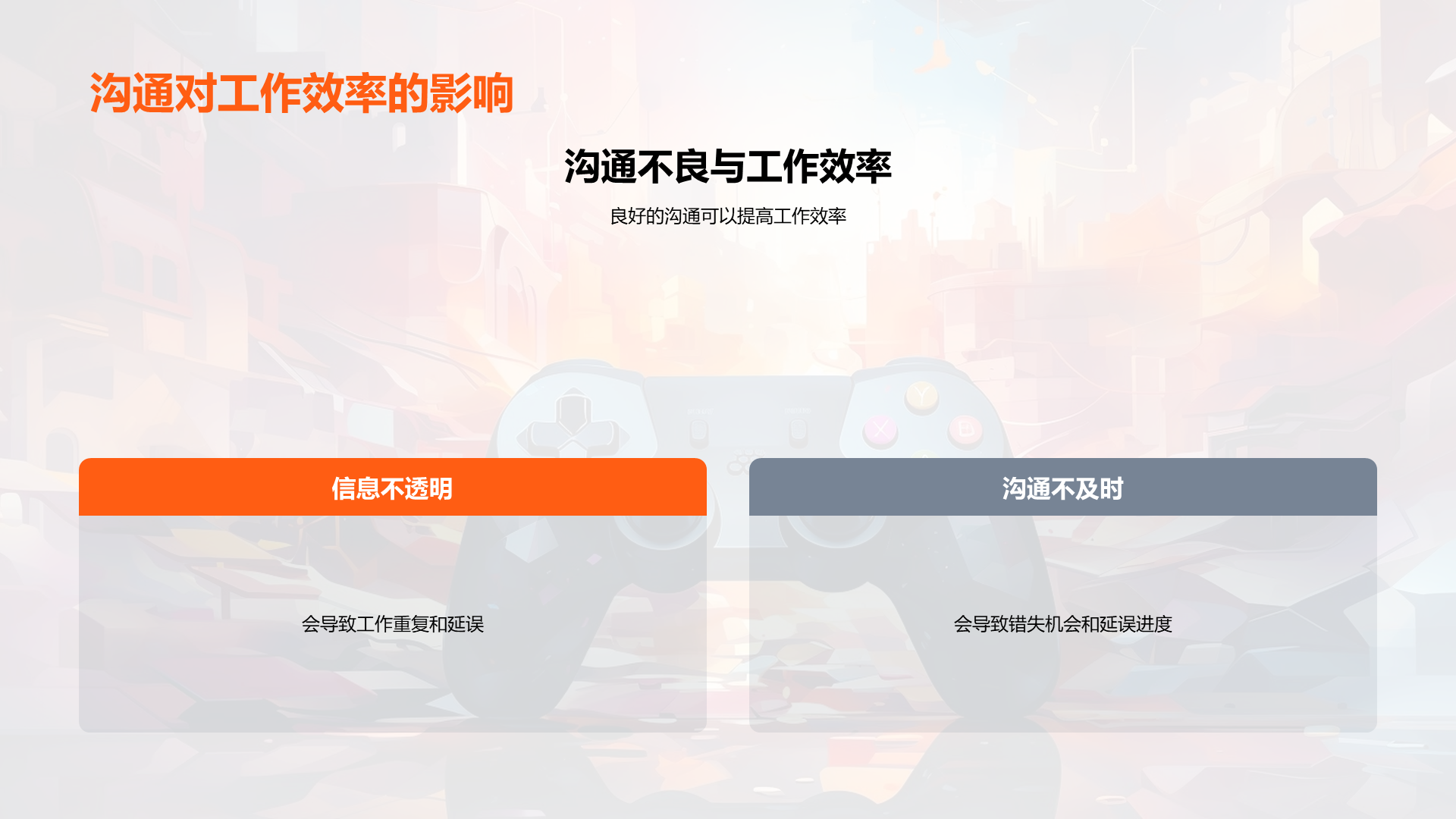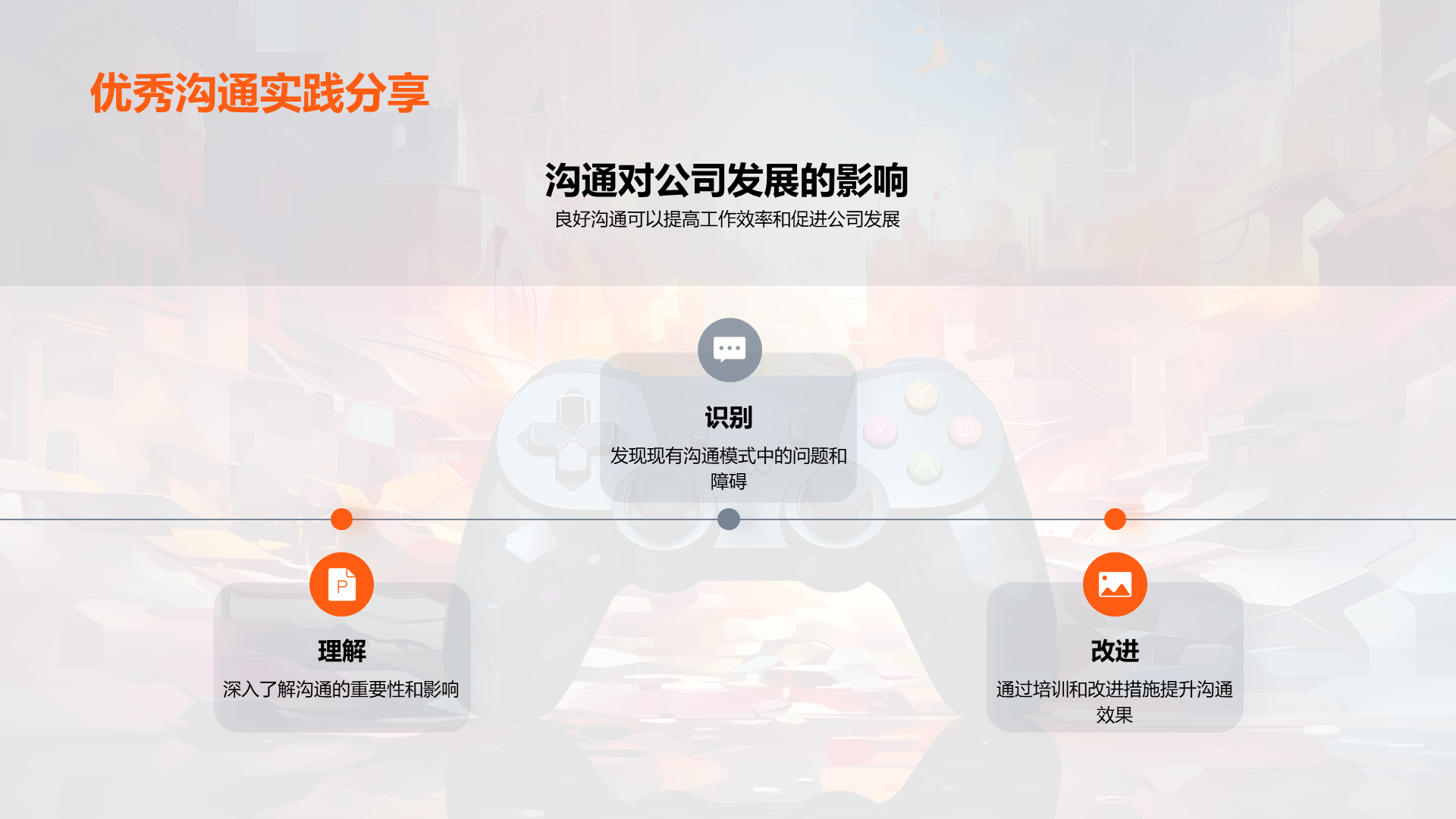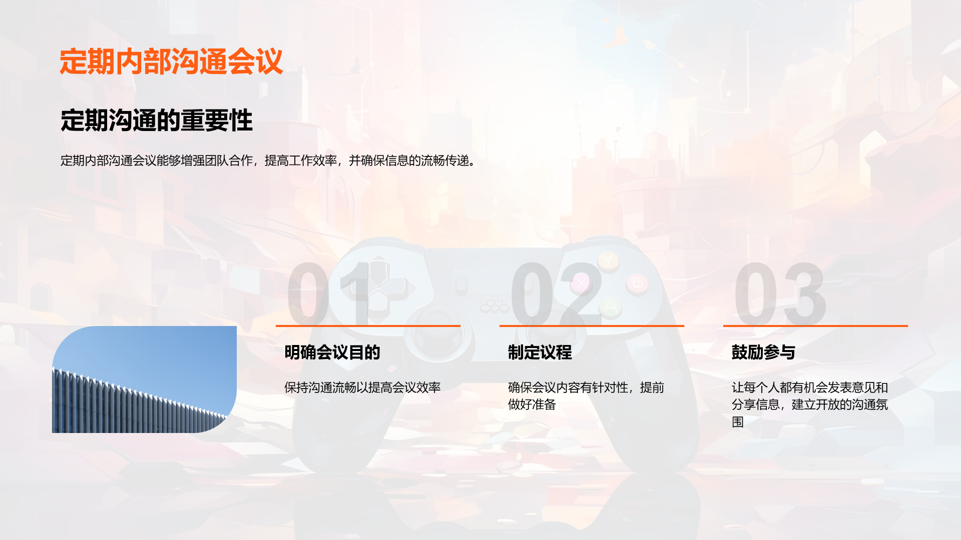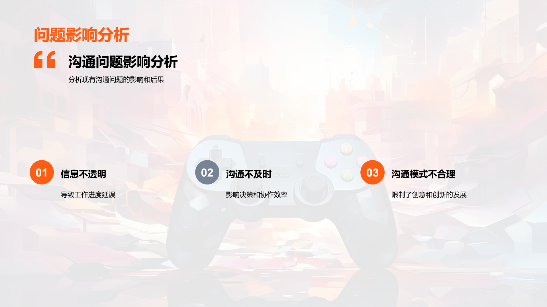 理解游戏开发的基本流程, 阐述内部沟通在游戏开发过程中的重要性, 分析公司现有的沟通模式, 识别出现有模式中的问题,如信息不透明,沟通不及时等, 说明良好沟通如何提高工作效率, 讨论良好沟通对公司发展的贡献, 提议定期的内部沟通会议, 建议 文件大小:4.24 MB 页数:28 页 分辨率:16*9 📸 产品预览 — 1秒登录查看完整内容 — 账号登录