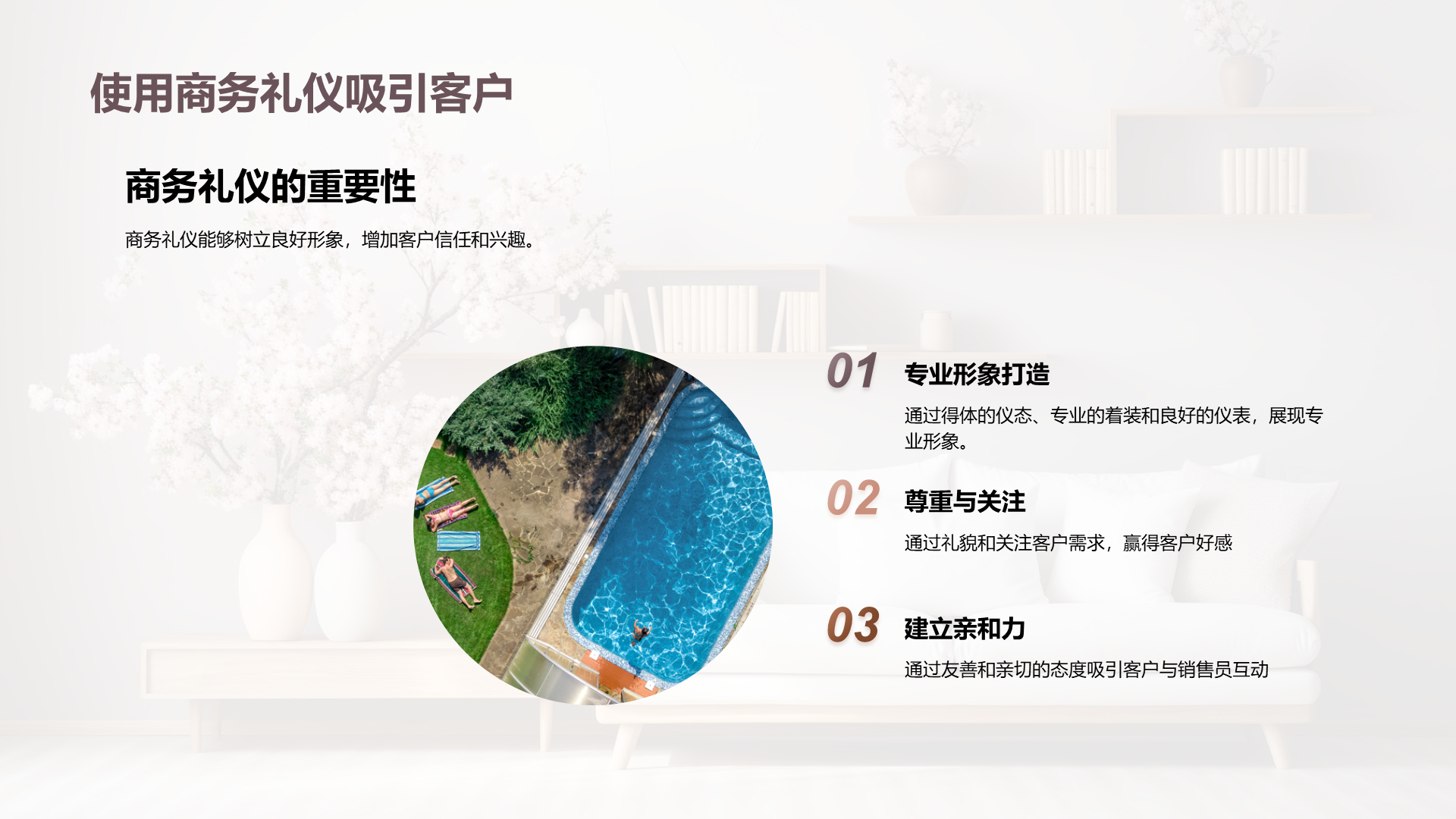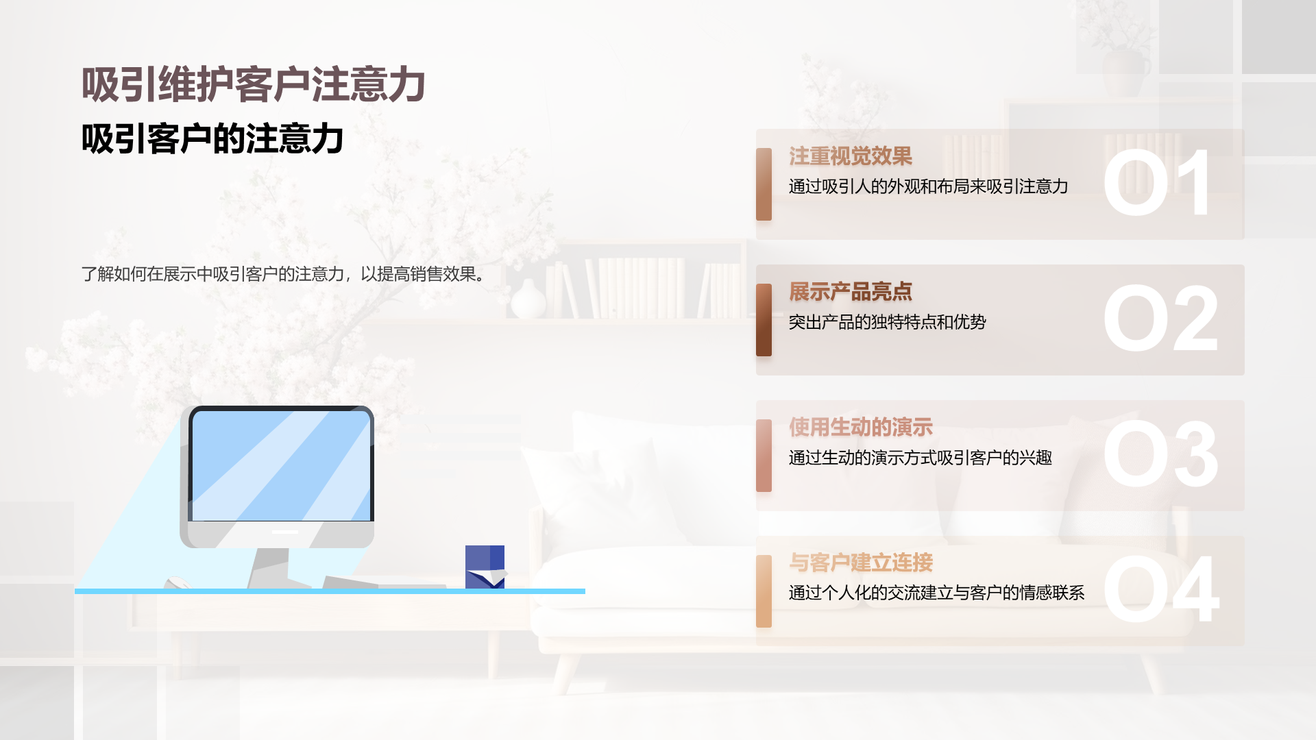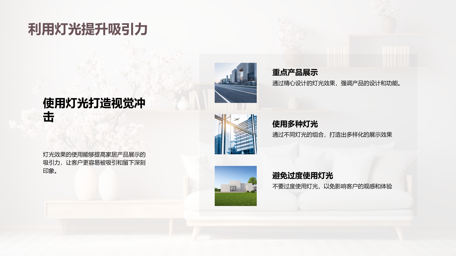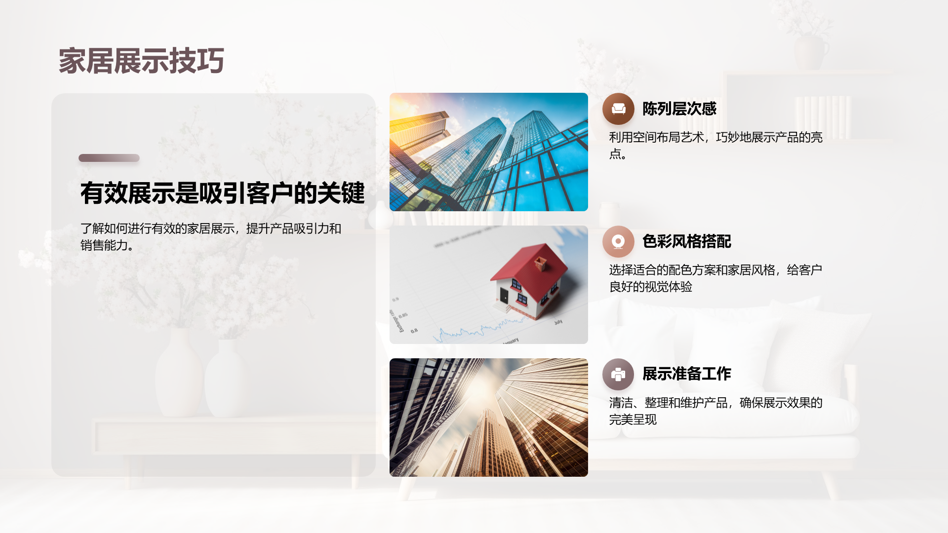 理解家居设计的基本概念, 家居设计的元素和原则, 了解如何进行有效的家居展示, 商务礼仪的基本规则, 商务礼仪在产品展示中的作用, 使用商务礼仪吸引客户,提升产品的吸引力, 注重产品的摆放和灯光效果, 使用恰当的语言描述产品的特点和优点, 文件大小:6.17 MB 页数:23 页 分辨率:16*9 📸 产品预览 — 1秒登录查看完整内容 — 账号登录