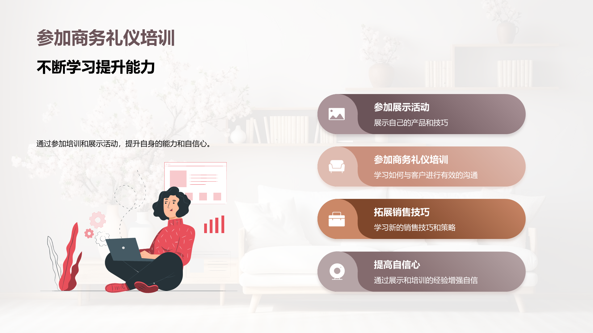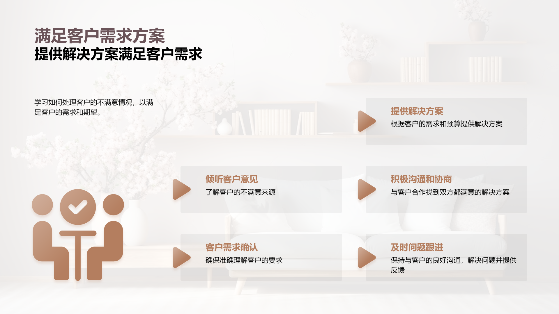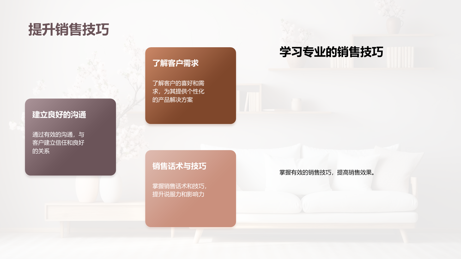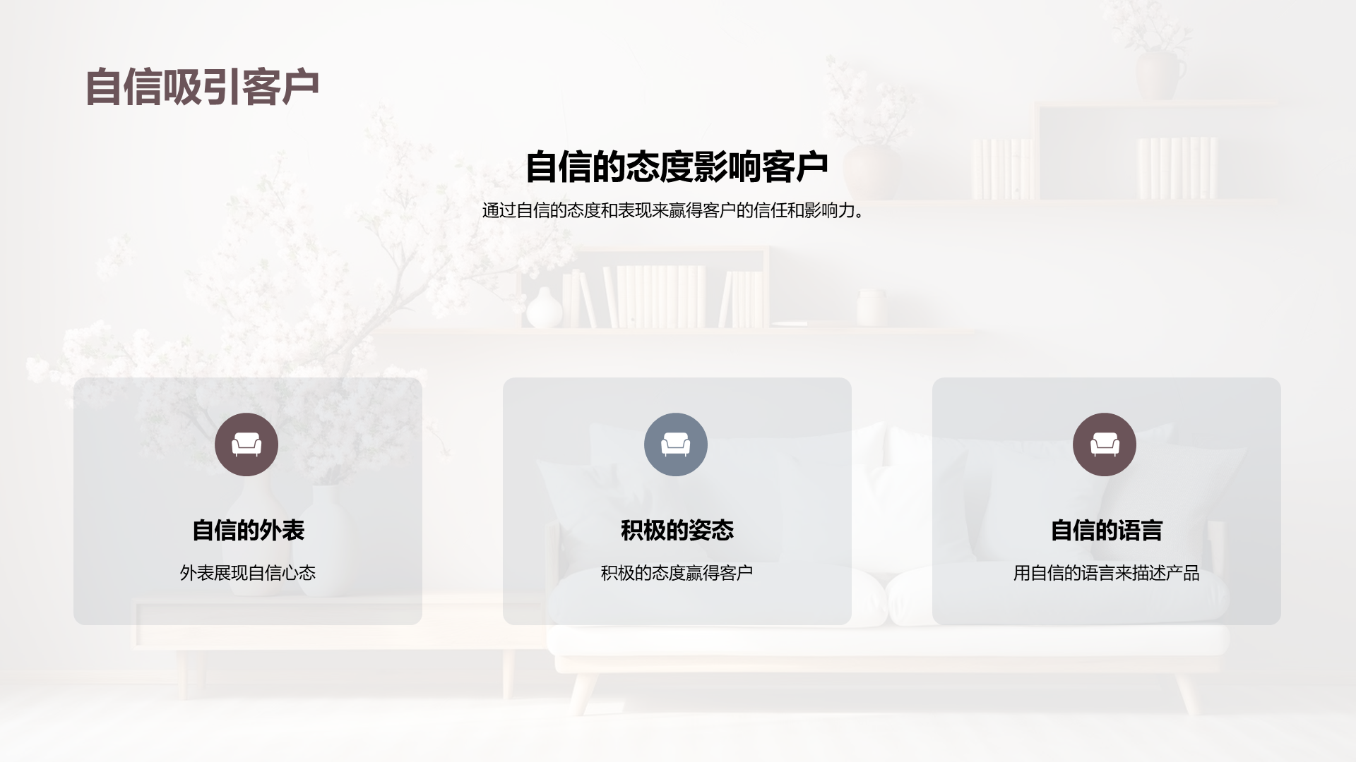 理解家居设计的基本概念, 家居设计的元素和原则, 了解如何进行有效的家居展示, 商务礼仪的基本规则, 商务礼仪在产品展示中的作用, 使用商务礼仪吸引客户,提升产品的吸引力, 注重产品的摆放和灯光效果, 使用恰当的语言描述产品的特点和优点, 文件大小:6.17 MB 页数:23 页 分辨率:16*9 📸 产品预览 — 1秒登录查看完整内容 — 账号登录