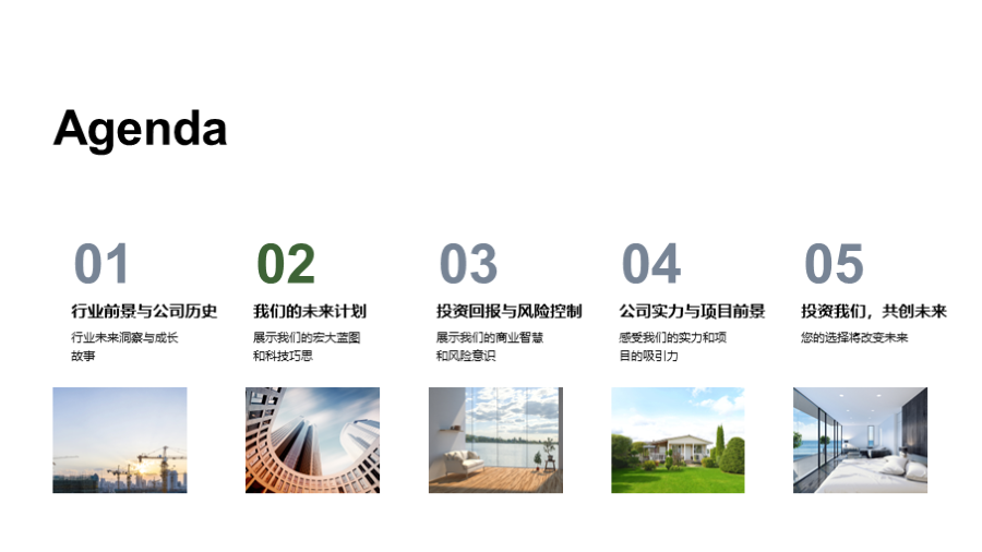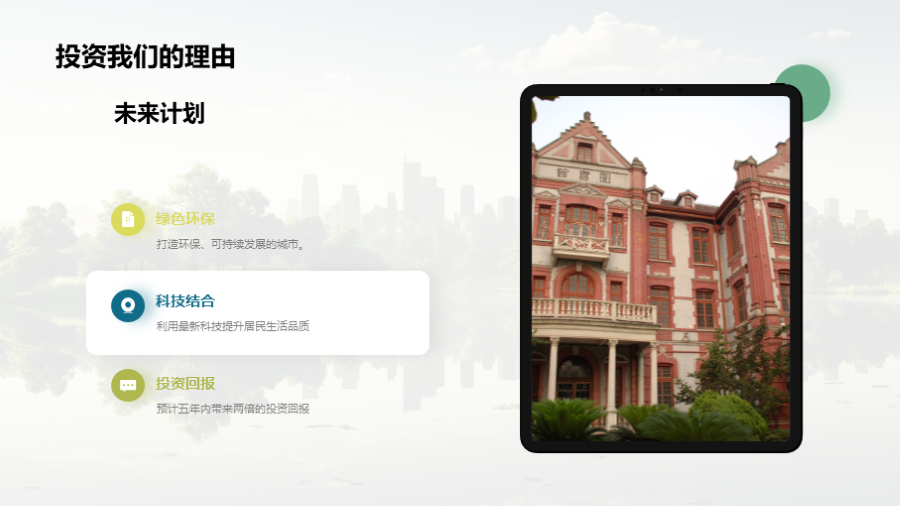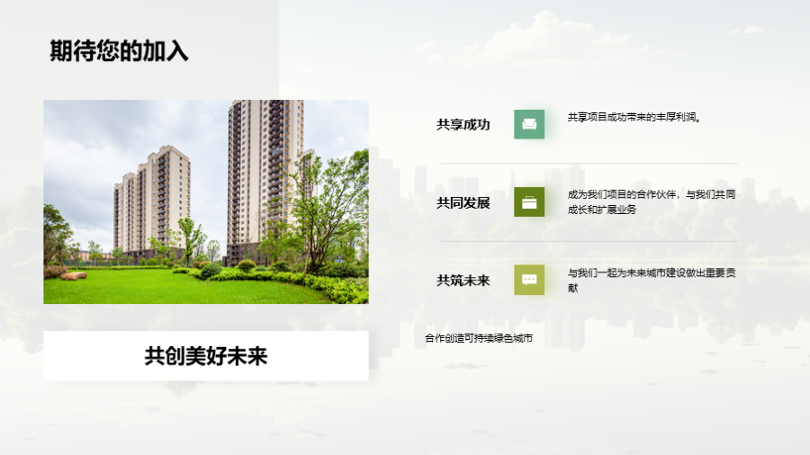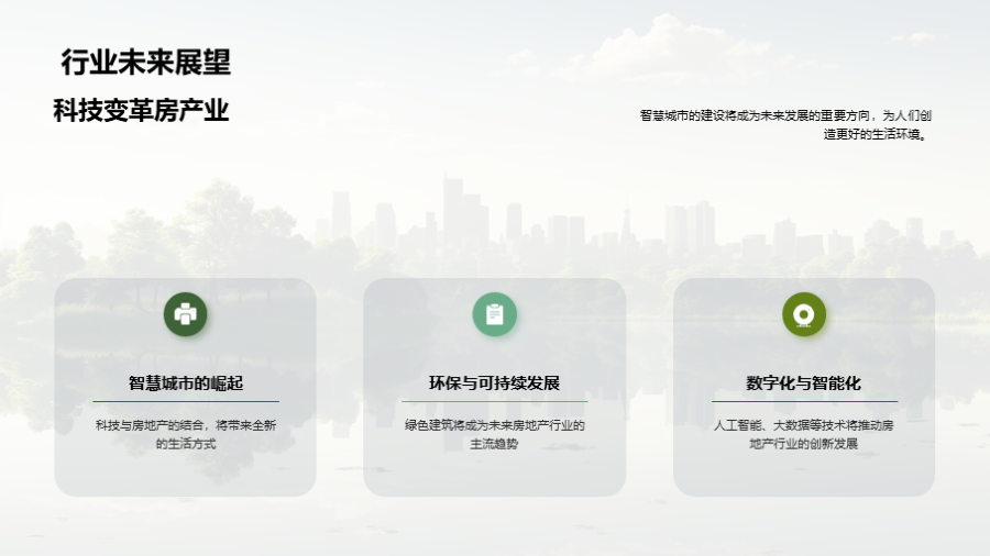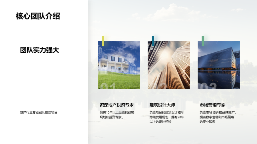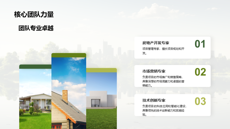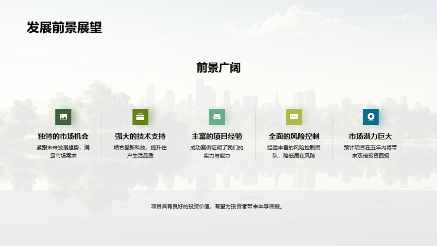 房地产行业的潜力和趋势, 公司的历史和成功案例, 公司的核心团队成员介绍, 未来我们计划建设一座绿色环保的智慧城市, 我们的项目将结合最新的科技进行建设,以提升住户的生活品质, 我们预计项目在五年内将带来两倍的投资回报, 我们有经验丰富的风 文件大小:7.86 MB 页数:33 页 分辨率:16*9 📸 产品预览 — 1秒登录查看完整内容 — 账号登录