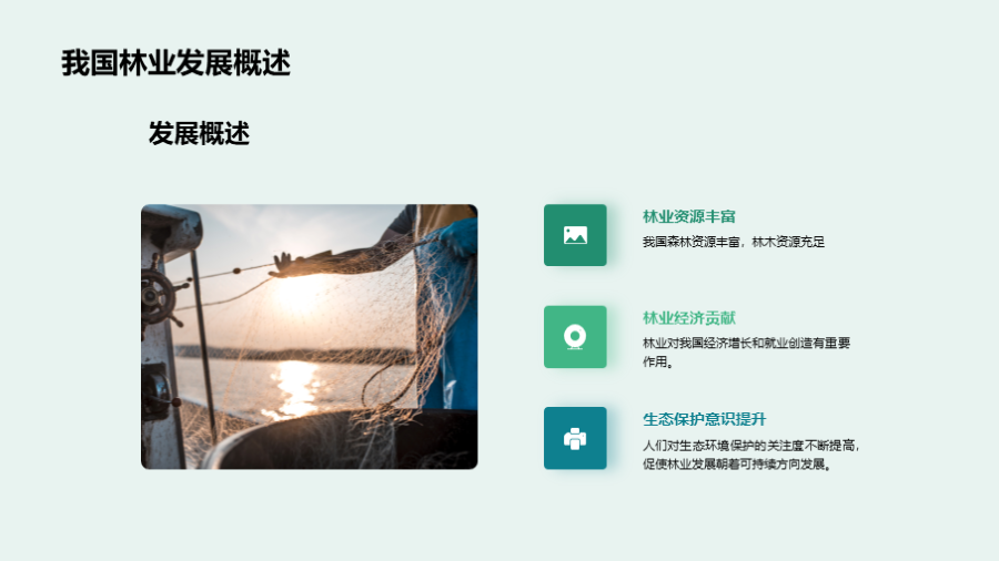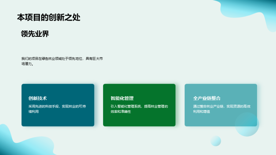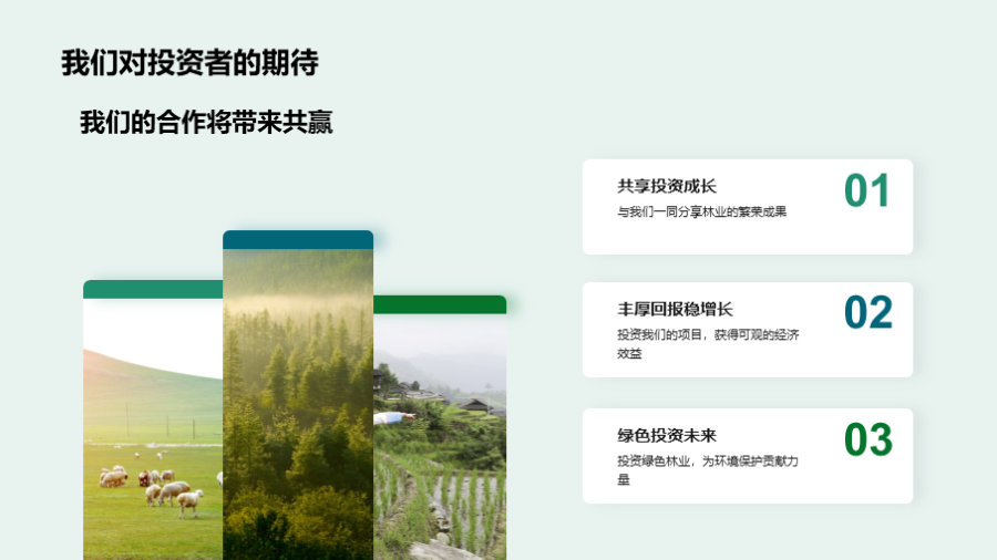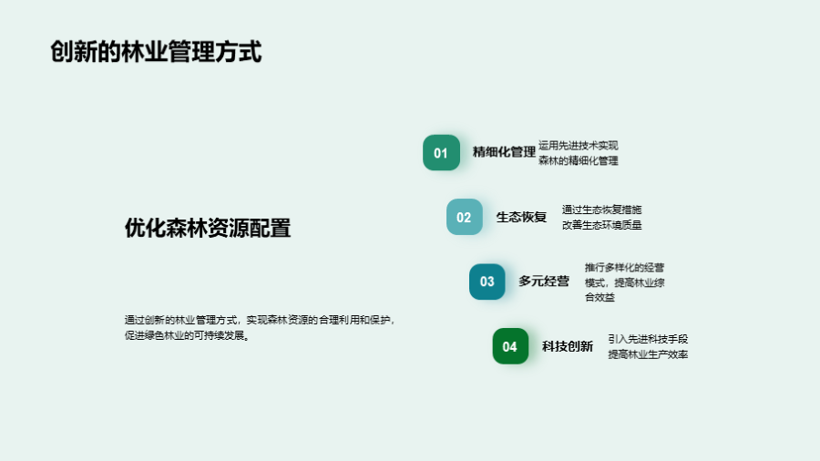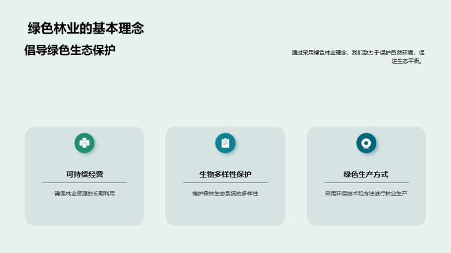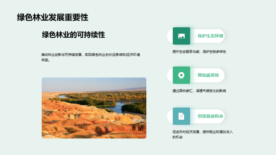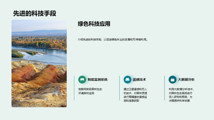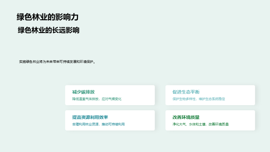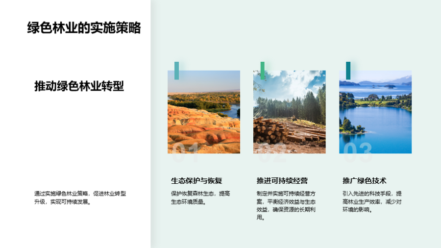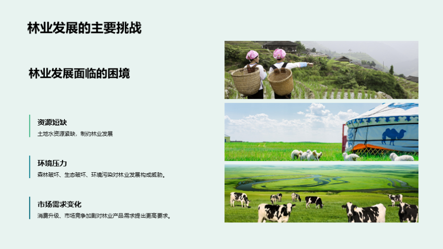 我国林业的发展现状, 我国林业发展的主要挑战, 我国林业发展的未来趋势, 绿色林业的基本理念, 绿色林业的实施策略, 绿色林业的长远影响, 本项目的创新之处, 本项目的市场潜力, 本项目预期的经济与环境效益, 创新的林业管理方式, 先进的科 文件大小:5.74 MB 页数:24 页 分辨率:16*9 📸 产品预览 — 1秒登录查看完整内容 — 账号登录