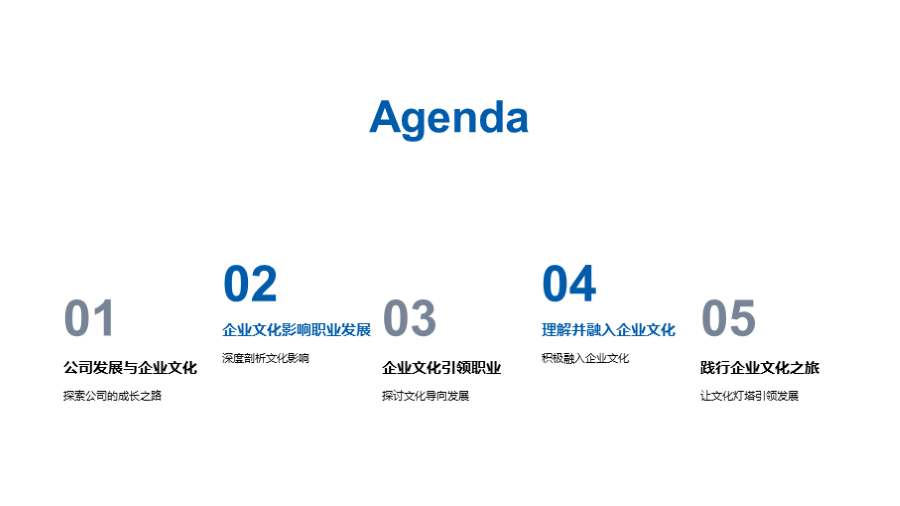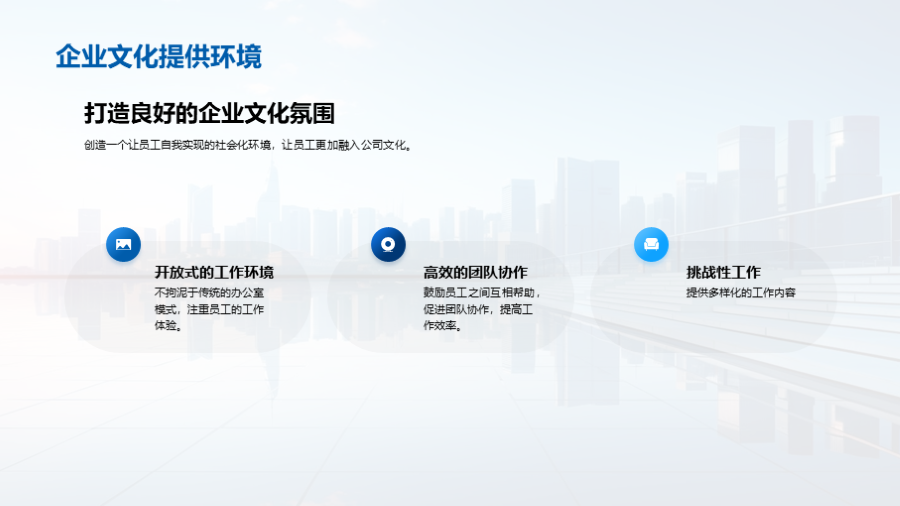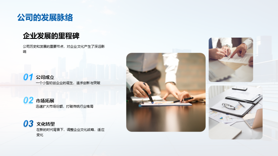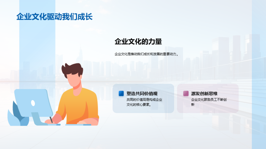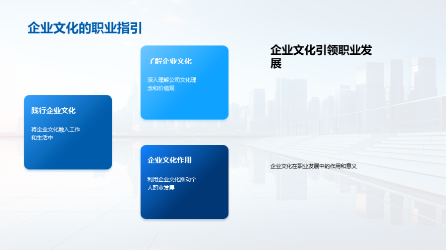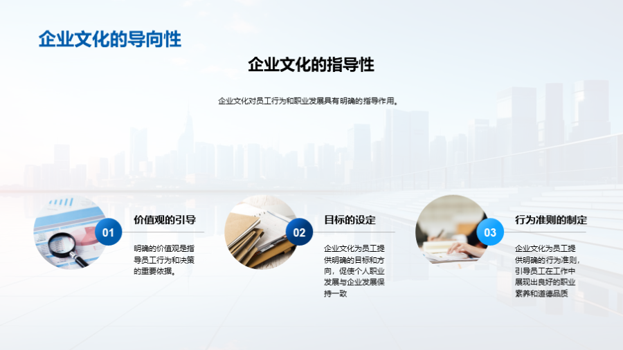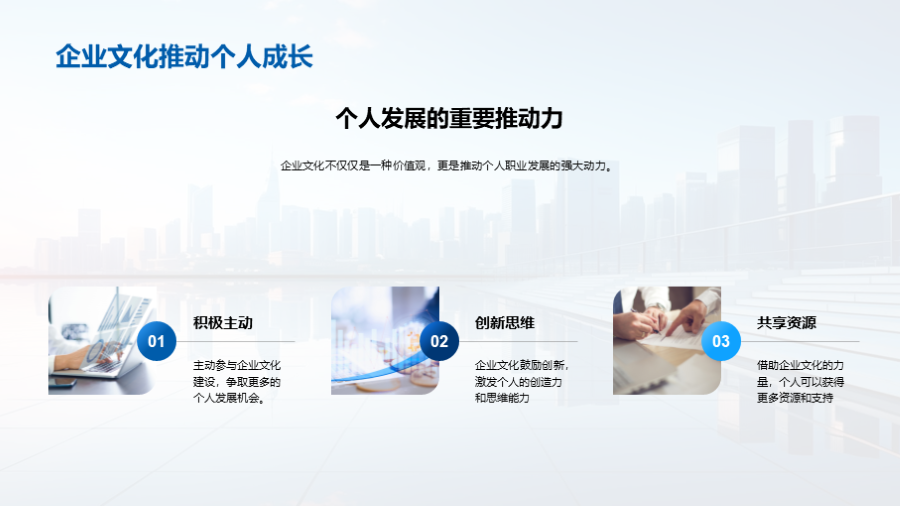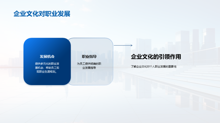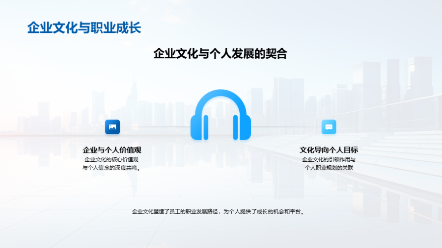 公司的历史和发展, 公司的企业文化理念, 企业文化与公司成功的关系, 企业文化对员工行为的影响, 企业文化对员工职业发展的作用, 优秀的企业文化带来的职业机会, 企业文化的导向性, 企业文化为我们提供的成长环境, 如何利用企业文化推动个人职 文件大小:2.47 MB 页数:33 页 分辨率:16*9 📸 产品预览 — 1秒登录查看完整内容 — 账号登录