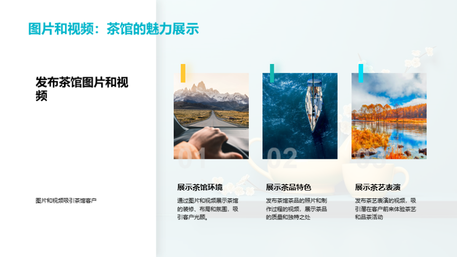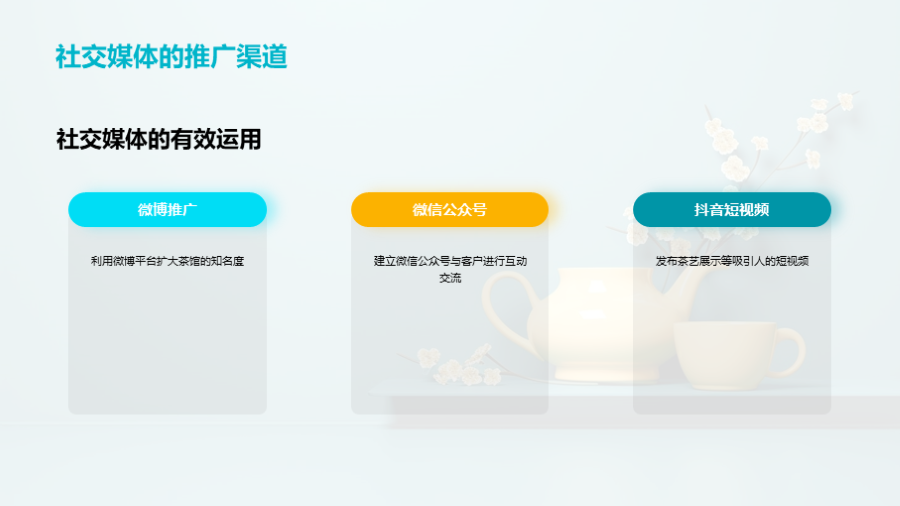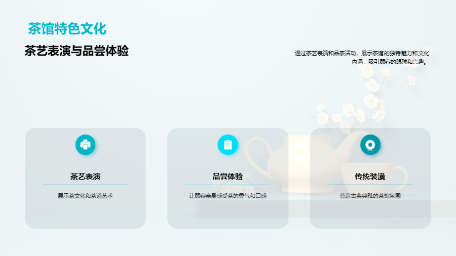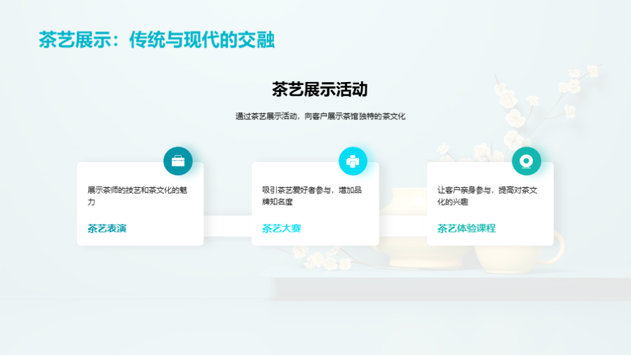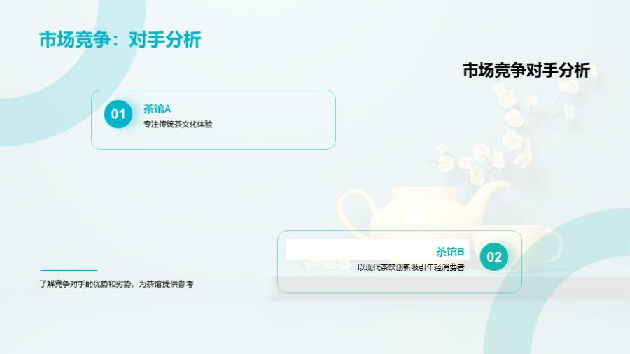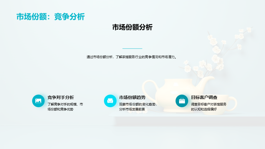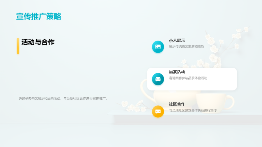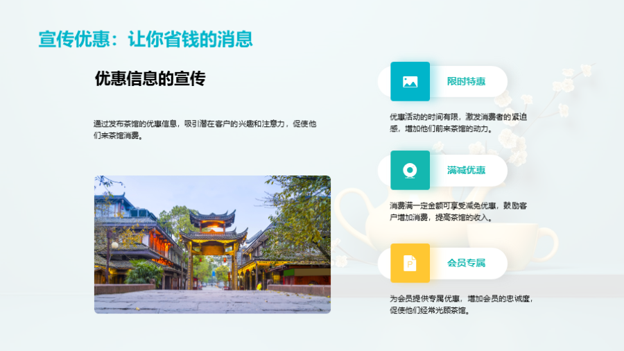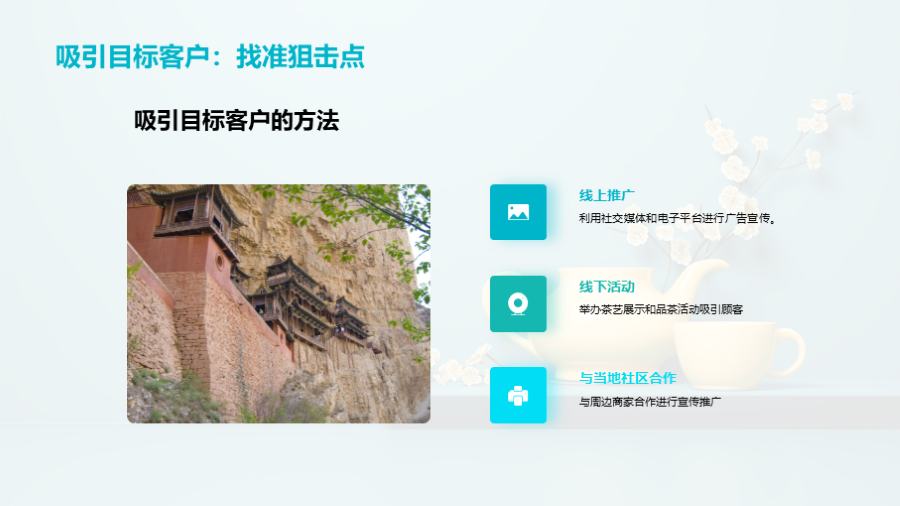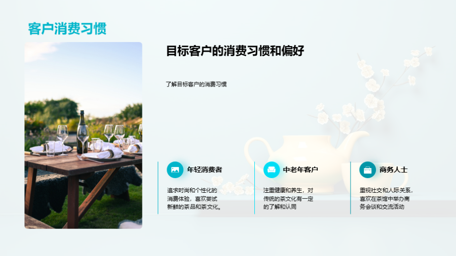 茶馆服务行业的竞争状况, 茶馆的独特特色和文化内涵, 目标客户的消费习惯和偏好, 注重茶馆的特色和文化内涵, 与目标客户的价值观和兴趣相关联, 发布茶馆的图片、视频和优惠信息, 吸引更多的潜在客户, 举办茶艺展示和品茶活动, 与当地社区合作 文件大小:4.78 MB 页数:28 页 分辨率:16*9 📸 产品预览 — 1秒登录查看完整内容 — 账号登录
