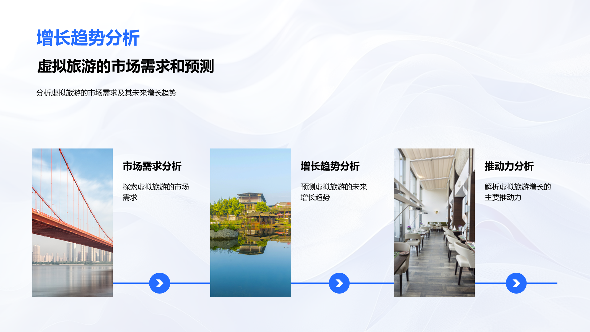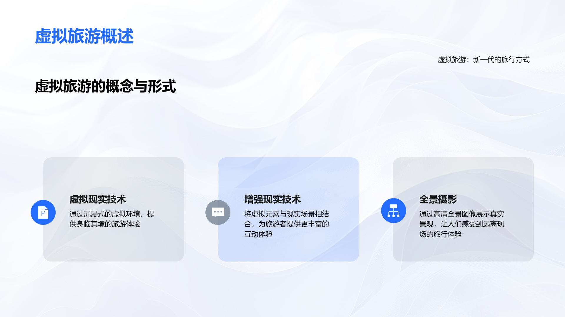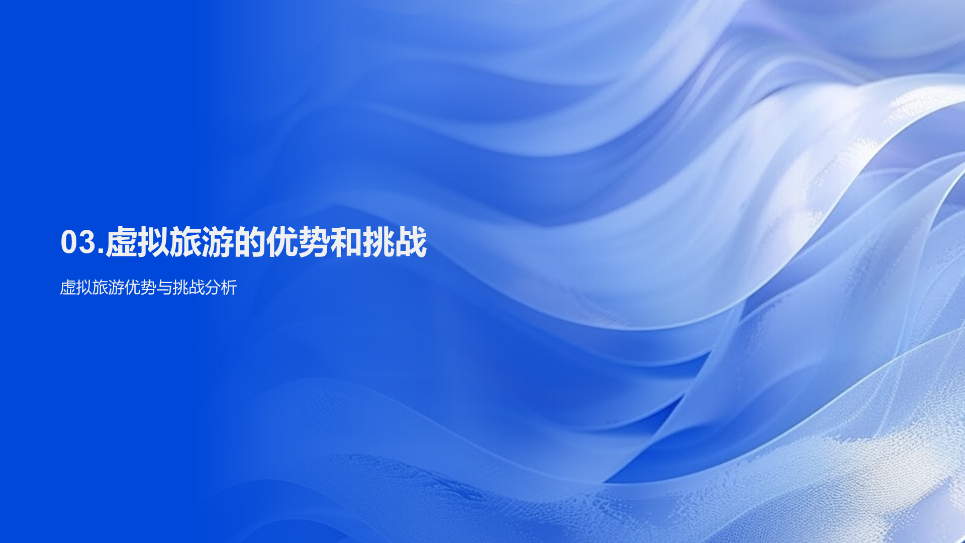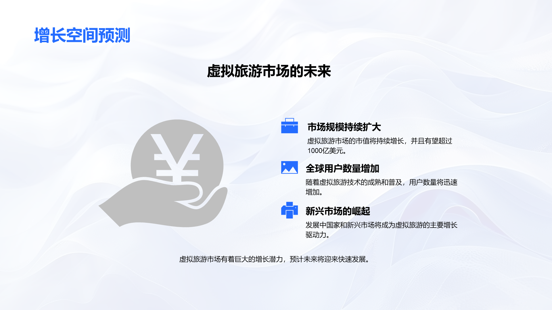简述虚拟旅游的基本概念, 展示虚拟旅游的各种形式, 详述虚拟现实技术如何改变旅游体验, 解析当前虚拟旅游的市场需求, 阐述虚拟旅游未来10年的市场预测, 说明明显的增长趋势及其推动力, 详述虚拟旅游的主要优势, 剖析虚拟旅游面临的主要挑战, 文件大小:6.34 MB 页数:26 页 分辨率:16*9 📸 产品预览 — 1秒登录查看完整内容 — 账号登录