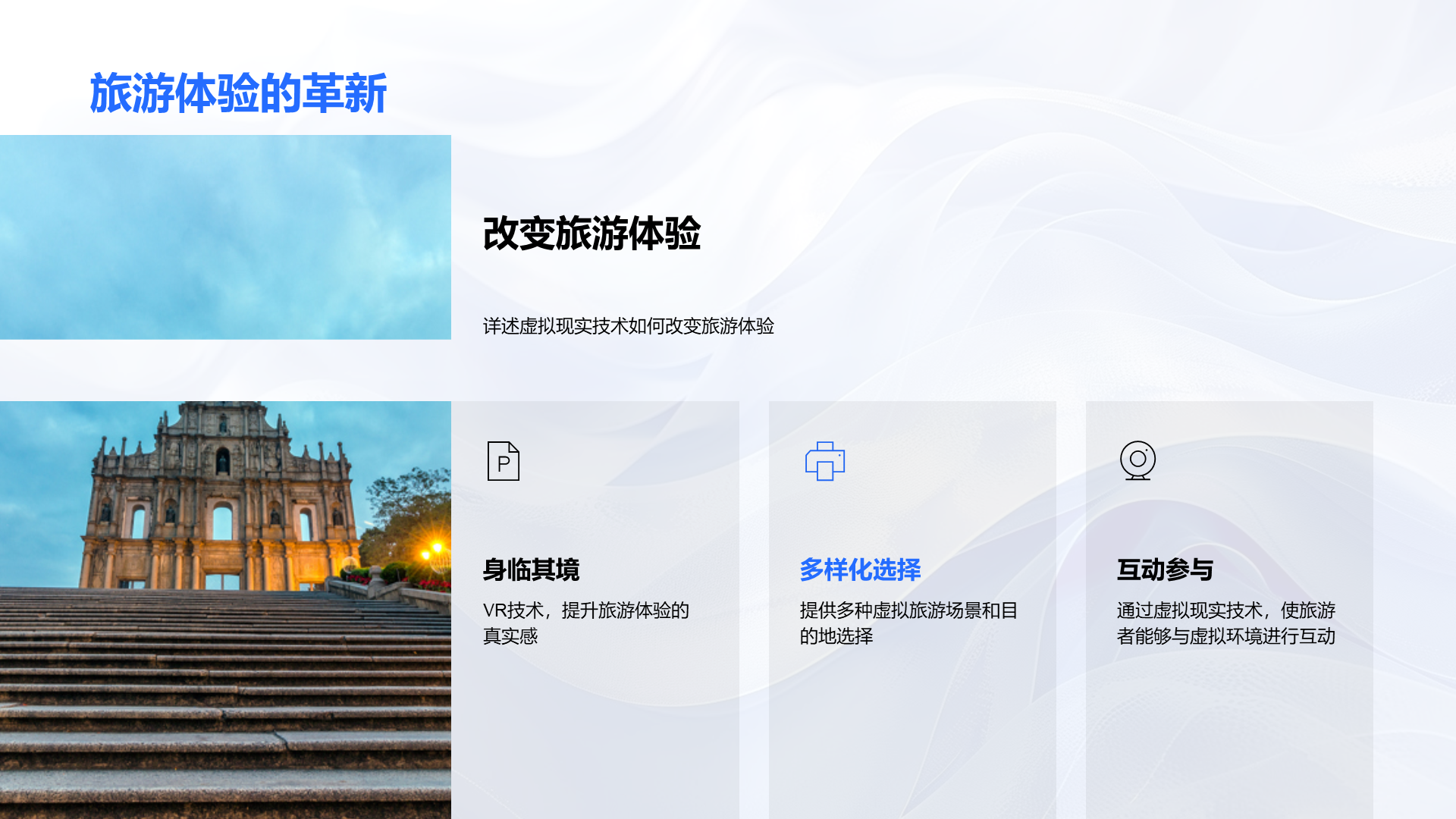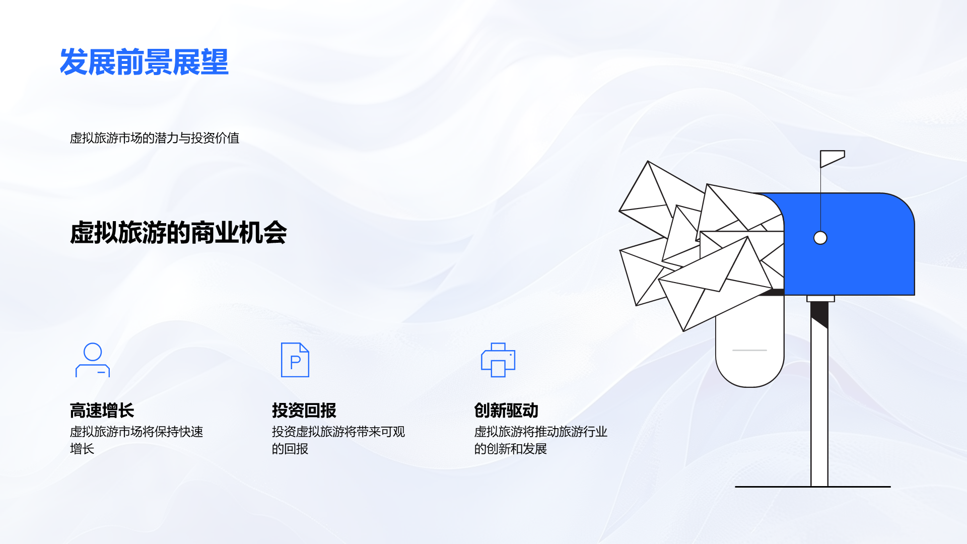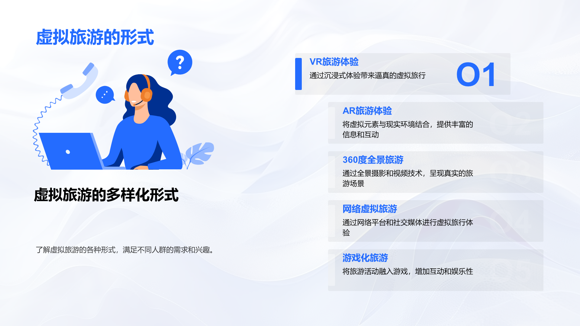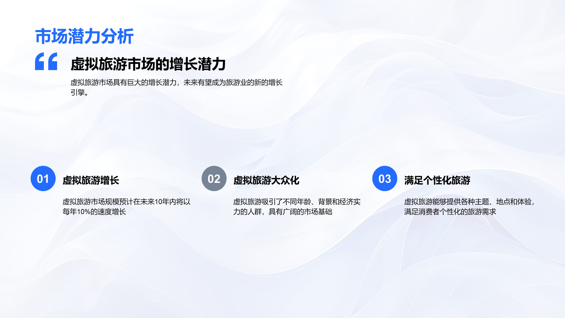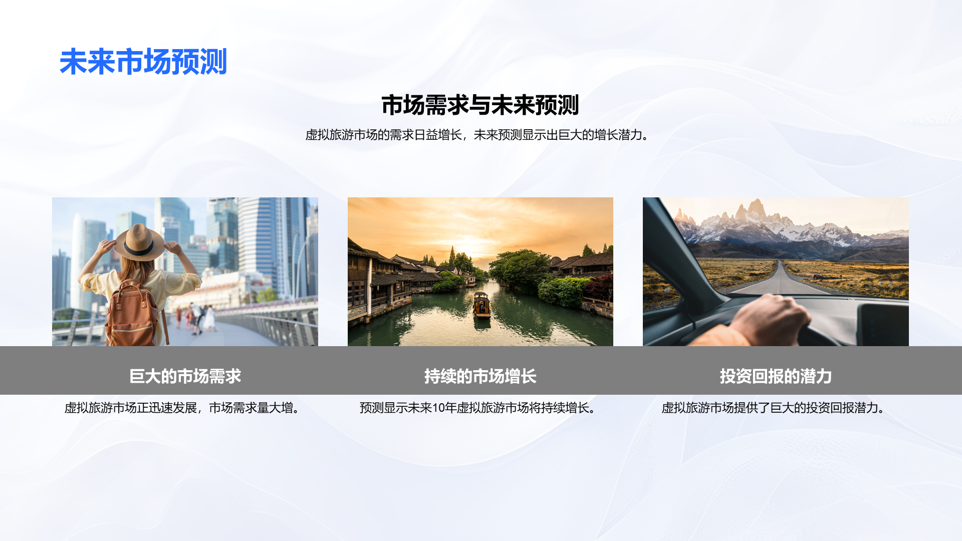 简述虚拟旅游的基本概念, 展示虚拟旅游的各种形式, 详述虚拟现实技术如何改变旅游体验, 解析当前虚拟旅游的市场需求, 阐述虚拟旅游未来10年的市场预测, 说明明显的增长趋势及其推动力, 详述虚拟旅游的主要优势, 剖析虚拟旅游面临的主要挑战, 文件大小:6.34 MB 页数:26 页 分辨率:16*9 📸 产品预览 — 1秒登录查看完整内容 — 账号登录