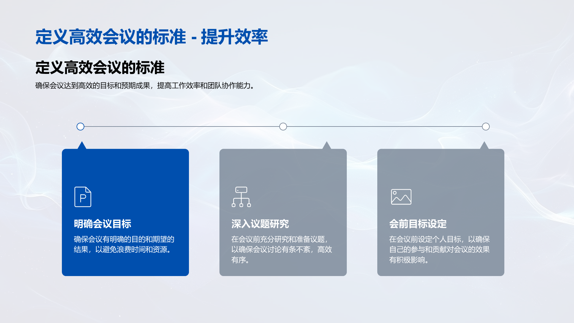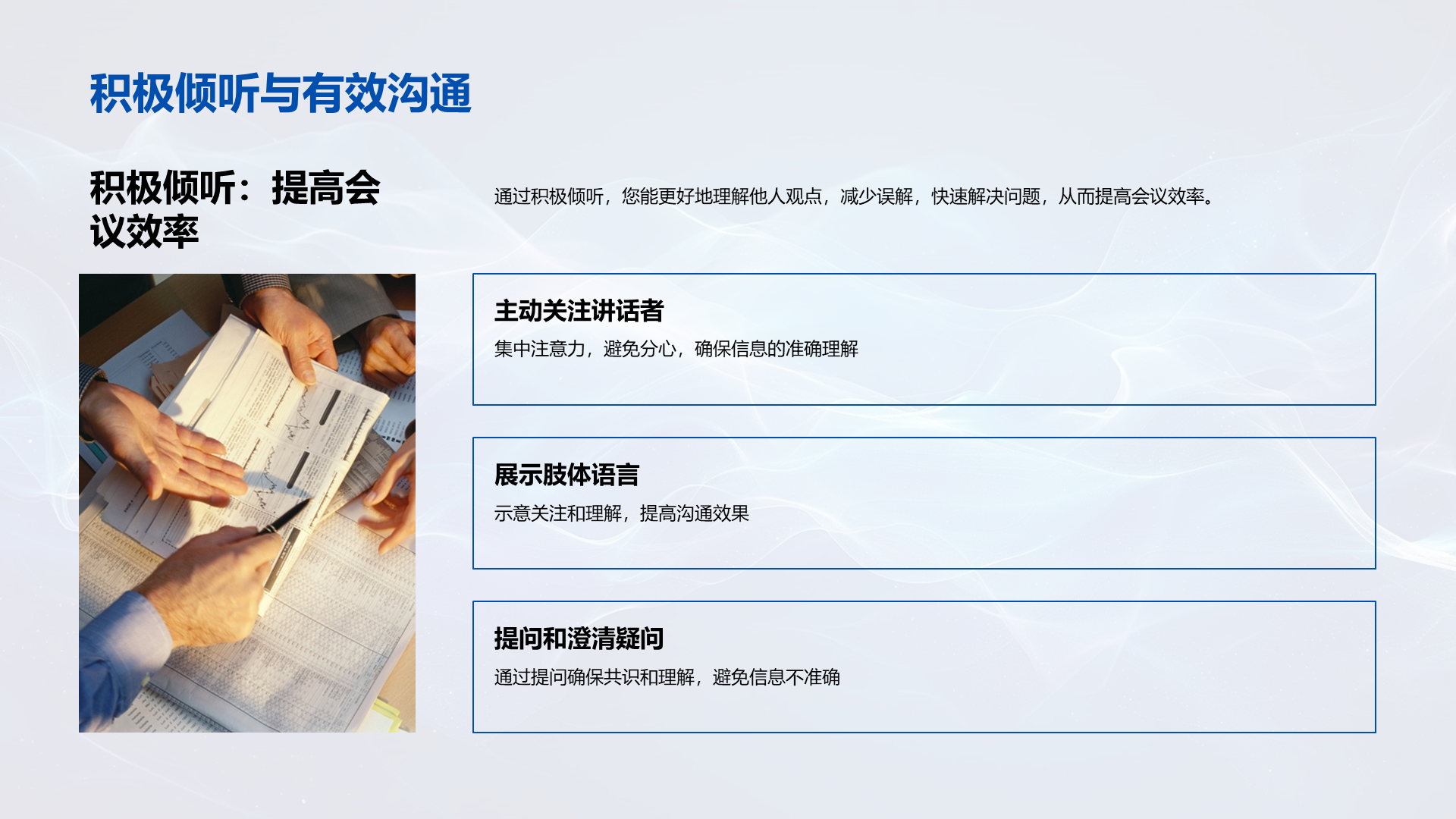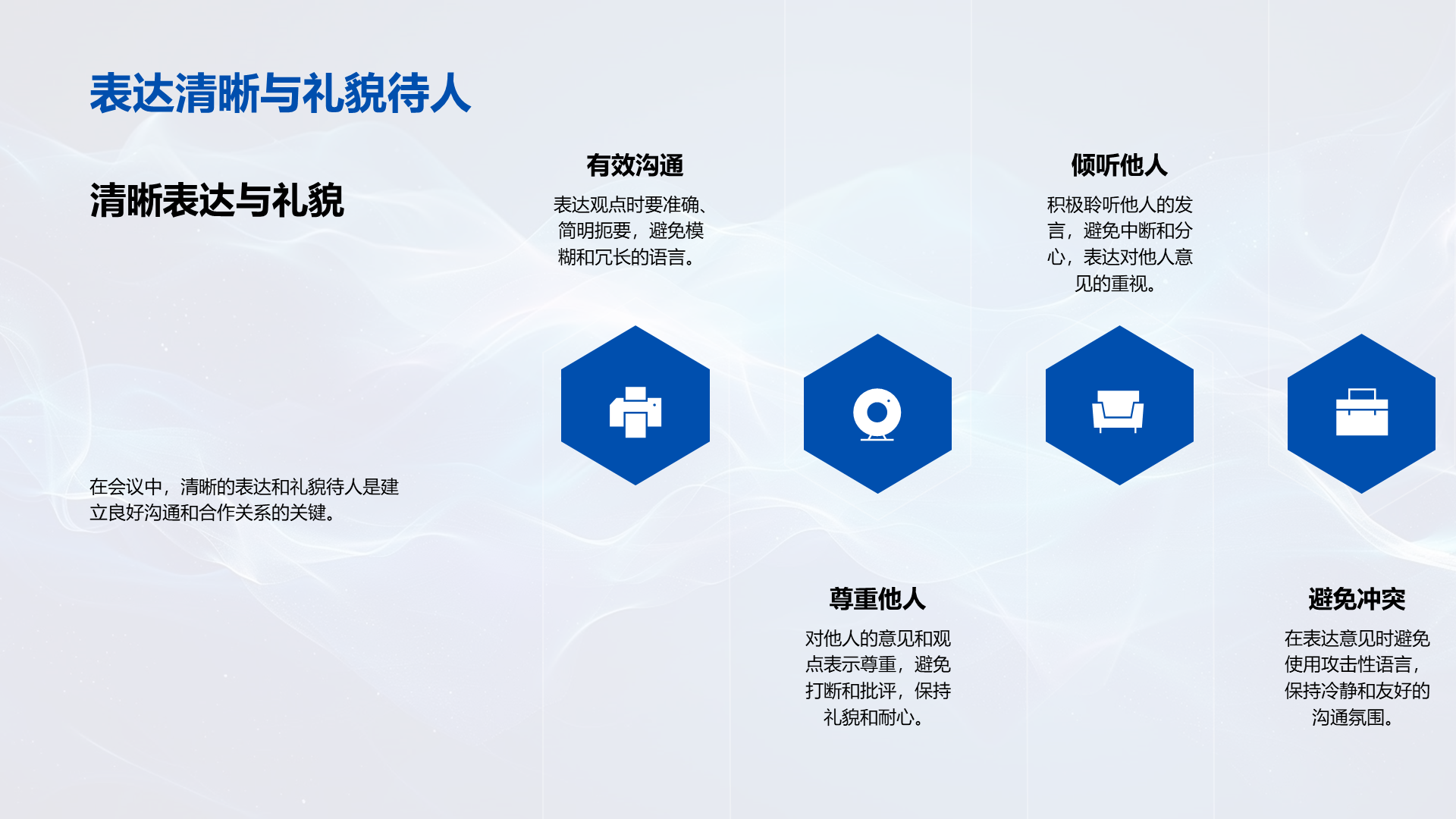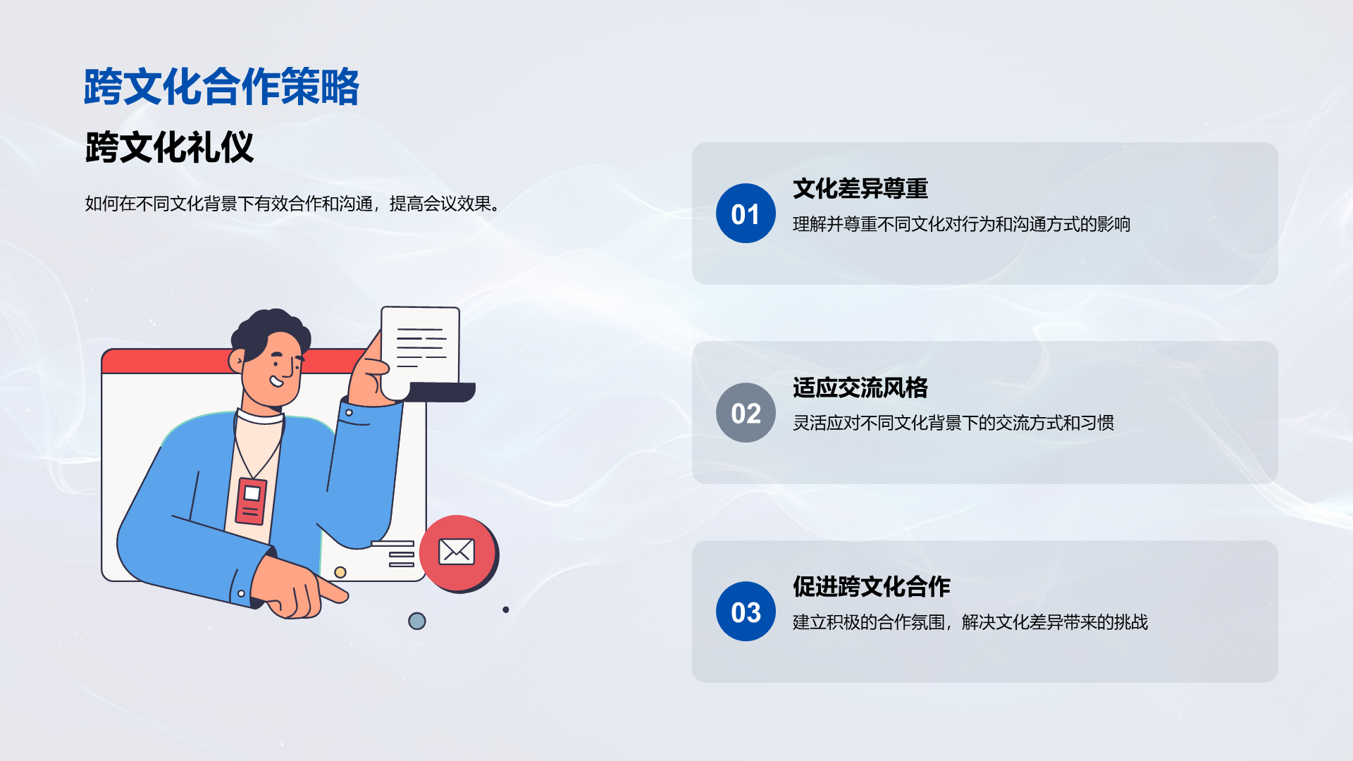 定义高效会议的标准, 关键角色和职责概述, 设计会议议程的最佳实践, 时间管理:开始、进行和结束, 积极倾听与有效沟通, 表达清晰与礼貌待人, 适时提出建设性意见, 处理异议和冲突的策略, 理解全球会议礼仪的重要性, 尊重不同文化的行为准则 文件大小:3.24 MB 页数:28 页 分辨率:16*9 📸 产品预览 — 1秒登录查看完整内容 — 账号登录