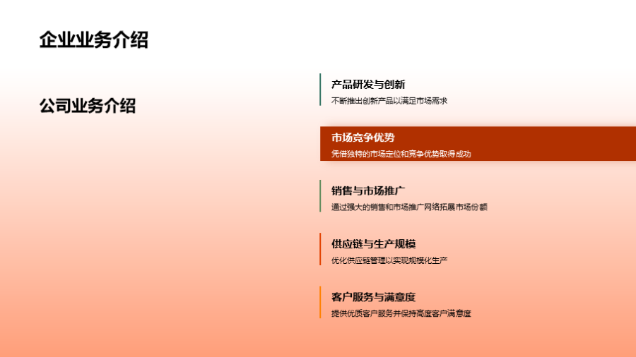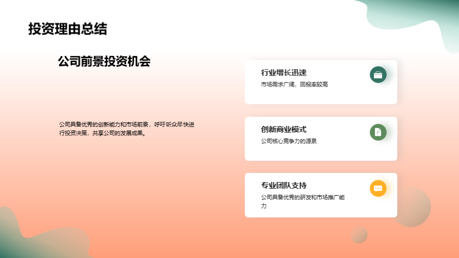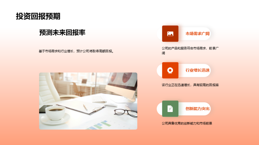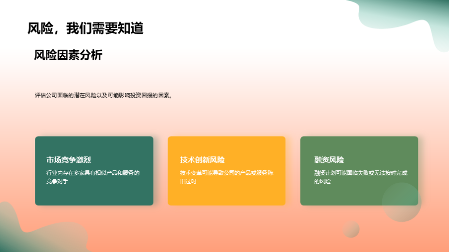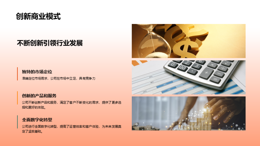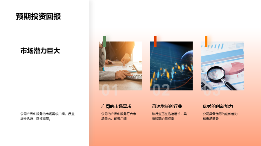 介绍公司的基本信息, 公司业务介绍及未来发展计划, 当前金融环境分析, 公司的核心竞争力来自于其创新的商业模式, 公司具备专业的团队, 融资资金将用于扩大生产规模, 增强公司的研发能力, 提升公司的市场推广, 公司的产品和服务有着广阔的市场 文件大小:4.16 MB 页数:28 页 分辨率:16*9 📸 产品预览 — 1秒登录查看完整内容 — 账号登录
